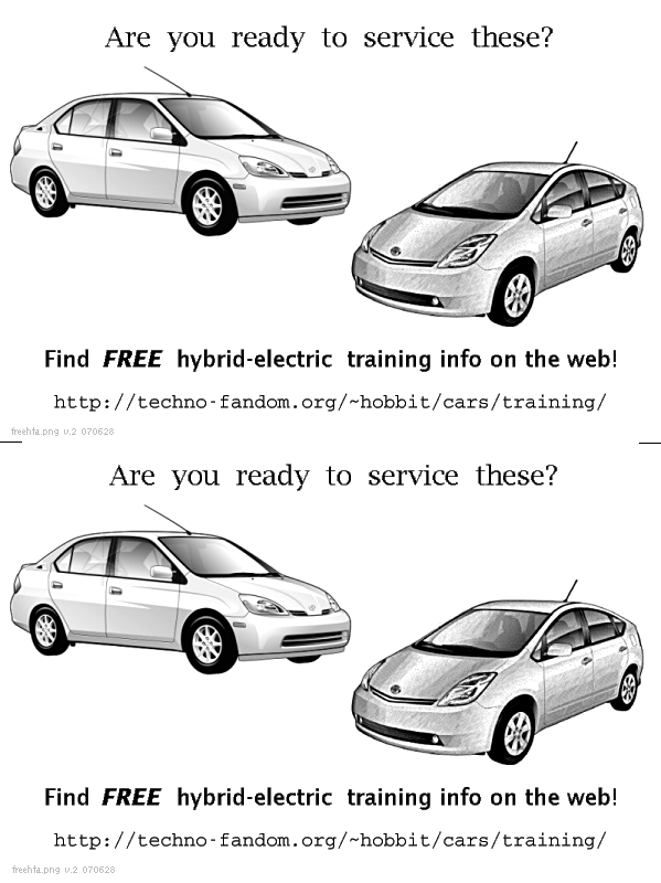 Hybrids are everywhere these days. Are you ready to service them? Your best tool for these vehicles is solid TRAINING and getting the right info to safely and effectively work on them. There is a certain amount of misinformation and rumor floating around, even within several emerging commercial seminar and training efforts. Get the straight story and become COMPETENT and CONFIDENT on these cars. They're here now, and customers are learning that they have maintenance options besides relying completely on dealership service. This information is gathered from all over -- public-domain information, patents, government labs, owner communities, and personal investigation and experience. You will see an understandable emphasis on the Toyota Prius, but many of the principles described will apply to all hybrid vehicles and even major aspects of electric cars and future developments. None of this content, including pictures, text, or overall structure, may be used as part of any third-party for-profit training offering, because it is all right here for free. You are, however, encouraged to direct students toward it as part of a training curriculum.