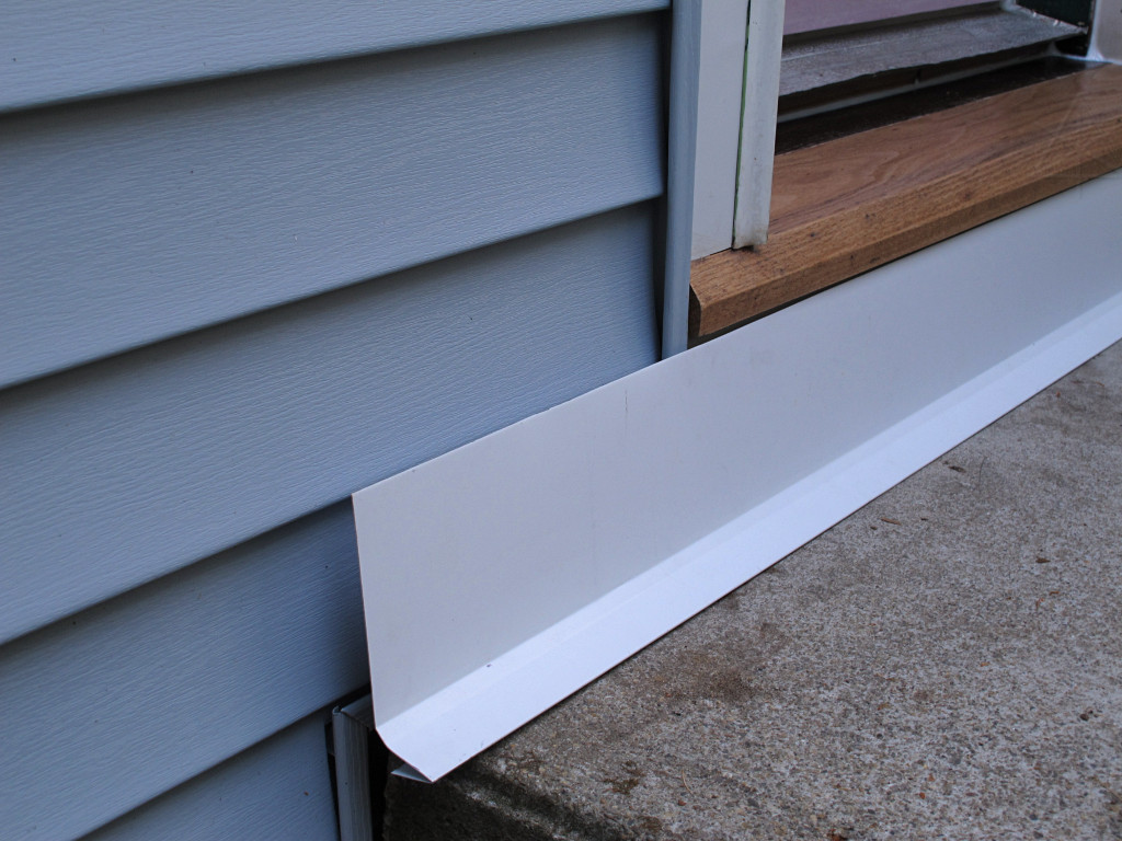 This is how splash-guard will fit The concept was pretty clear, and this piece was the perfect shape to fit up under the sill nose and hang over the stoop edges a little bit. The only problem was how to flash it in with the siding around the door. To do that, I had to get some of the siding apart.
