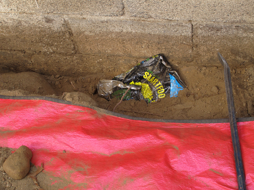 The Mighty Homebuilt Dirt-Tamper of Doom emerged once again, and was the perfect width to get down into these trenches to compact the backfill. I did this in incremental layers, to ensure best uniform density all the way up, and managed to not ding up the face of the Roxul too much with mis-aimed hits. This might have been the only part that would have annoyed the neighbors, as the soil hereabouts is fairly resonant when impacted. Thump, thump, thump, thump thump ... thump, thump. Thump, thump, thump thump thump thump thump thump ... thump, thump ... |
