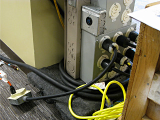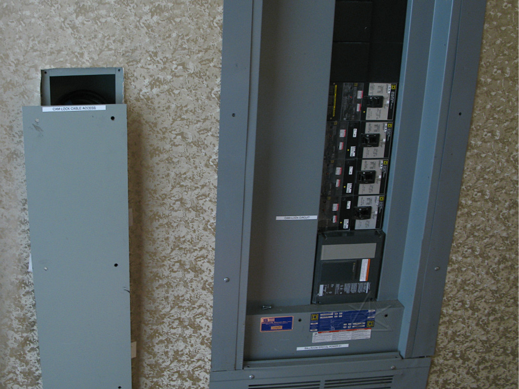 Power panel at the back of section A. 200 amp Camlok feed, and three 50-A circuits to the "stove plug" outlets. In short: plenty. |