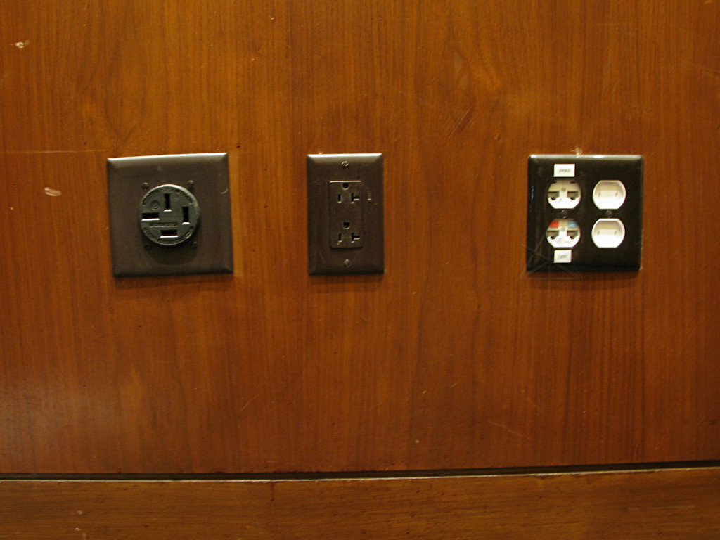 Said stove-type outlet, type NEMA 18-50R [on the left]. Supposedly for three phases and ground; unclear how they're deriving a proper Neutral from this. |