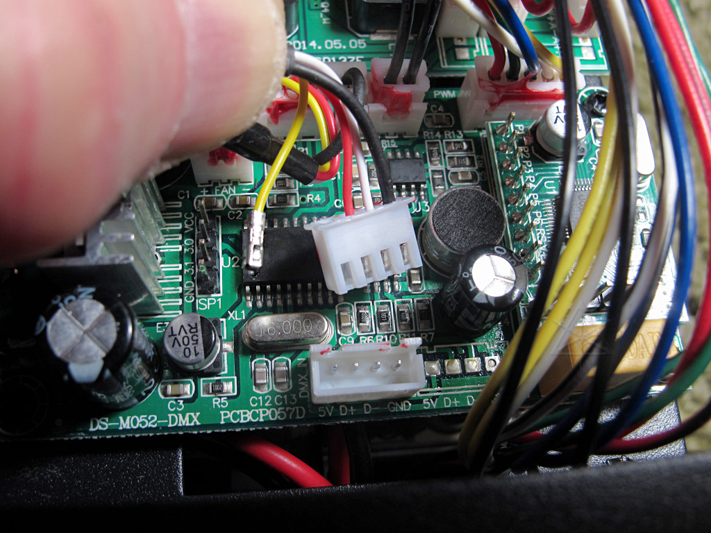 Near the connector where DMX data arrives we find a bog-standard 75176B transceiver chip, and we can easily dope out the surrounding bias network for the RS485 line coming in. Yes, these units each have one -- 10K to +5 and ground. And 100 ohm series resistors, which we've already determined aren't really necessary for "matching" line impedance. For more on bias networks and their rationale and why connecting too many receivers that provide bias might lead to some transmission problems, see this DMX discussion. As is typical with these units, any self-run setting is likely to begin *sending* data on the DMX bus with the expectation that slave-mode units are listening, so in a typical installation with a controller it is essential to leave all units in "Addr" mode with the correct addresses set. This is true via wiCICLE or hardwire, of course. Slave mode appears to go into 10-channel mode on address 001 so a master unit can control all attributes with relatively short packets. |