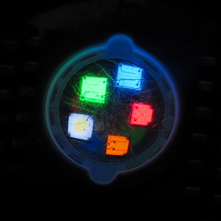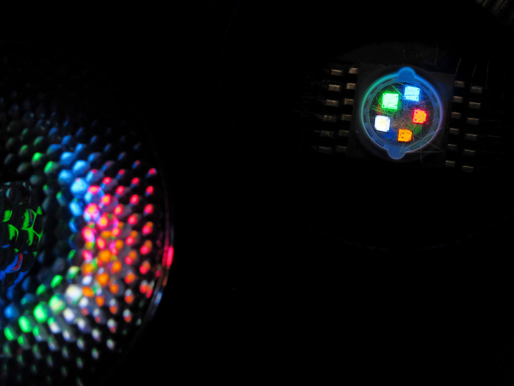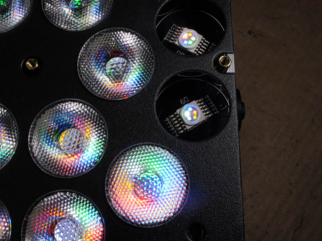 At DMX value 001, the emitters pop on with a gentle glow that's clearly visible but not too bright to photograph. |