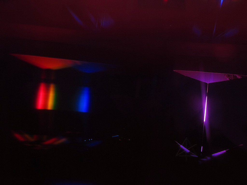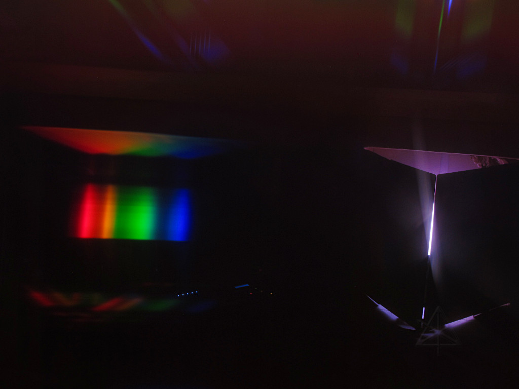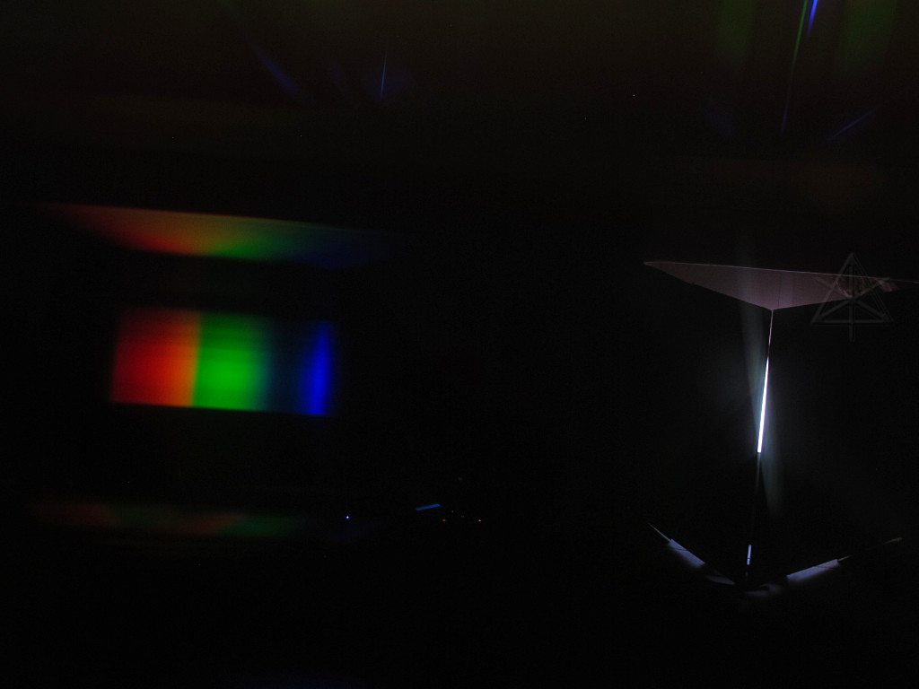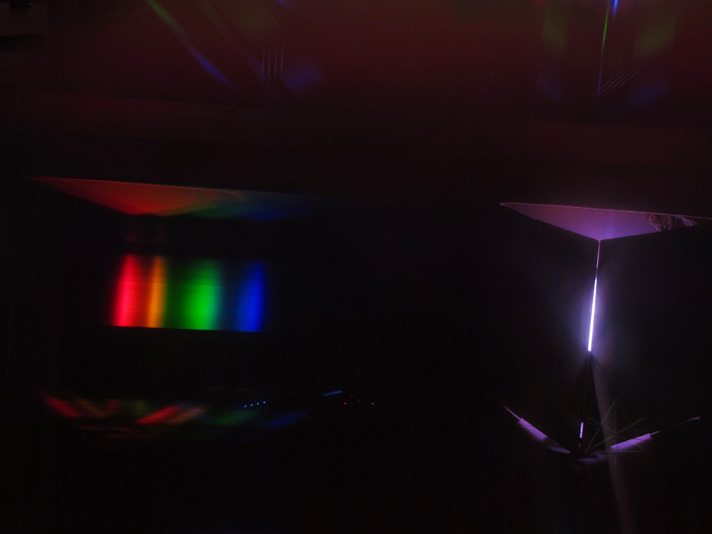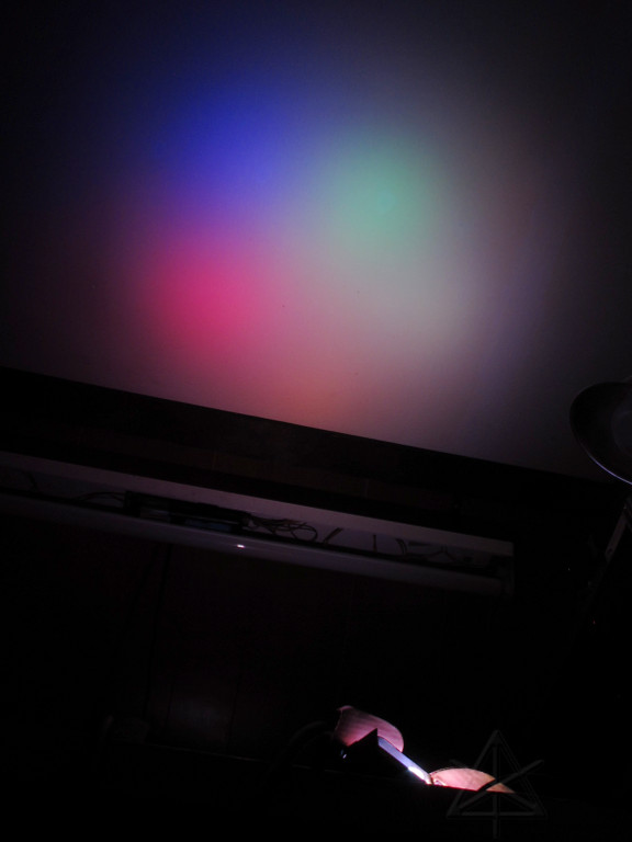 While adding amber and white to an LED unit nominally allows creation of those delicate theatrical pastel colors that should look decent on flesh, it's still not perfect color rendering. Most LEDs are inherently peaky sources, which is one reason typical RGB output delivers such punchy color purity to our perception. To analyze what I'll get from the Rokbox RGBAW, I've set it up inside one of the shipping boxes with the flaps forming a narrow slit across the output. A piece of high-dispersion-angle holographic diffraction grating held over the camera lens shows a nice first-order spectral spread of what's emerging from the slit, enough for a pretty solid qualitative view of what we're getting. |