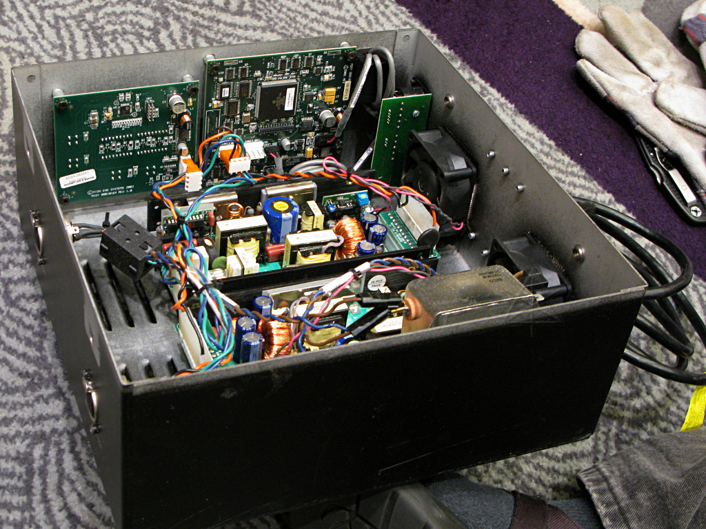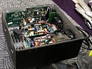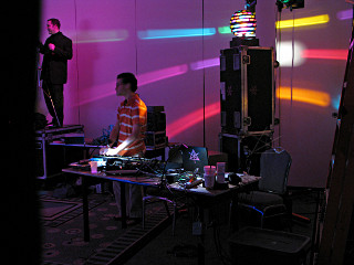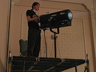 Some of the crew noted that the assembled ColorMerge units, the dichroic CMY computer-controllable color-changer units at side-stage, were cumbersome to hang. Yes, they're both heavy and fragile. Fortunately I had some folks on crew who also do the GSP shows at MIT and are familiar with these units already. Build night pretty much ended on the usual note, i.e. aligning the position presets of the moving-lights to hit the correct points on the dance floor and cyc. |