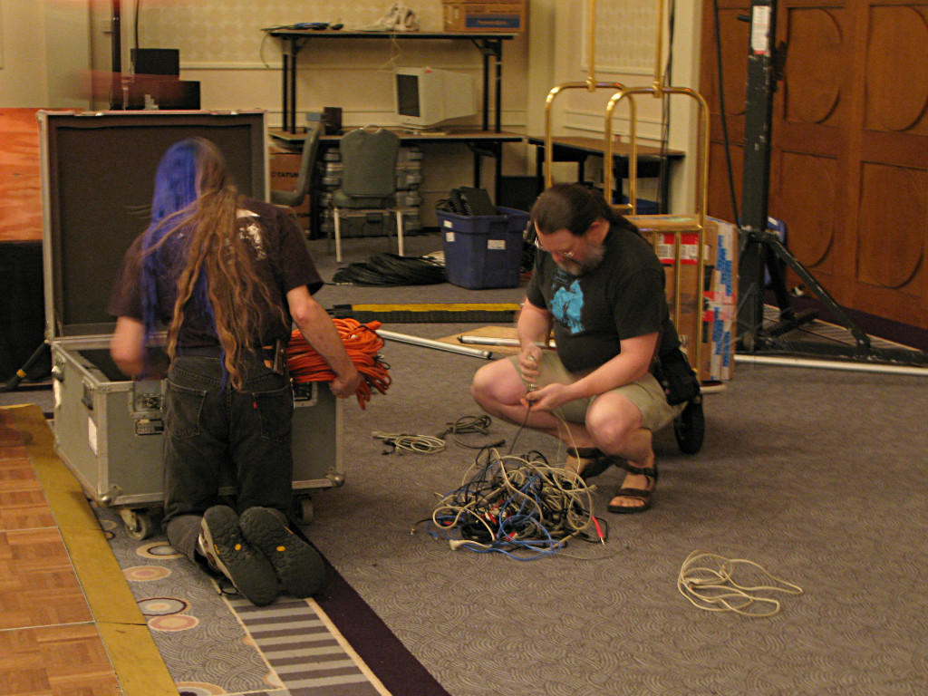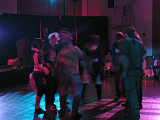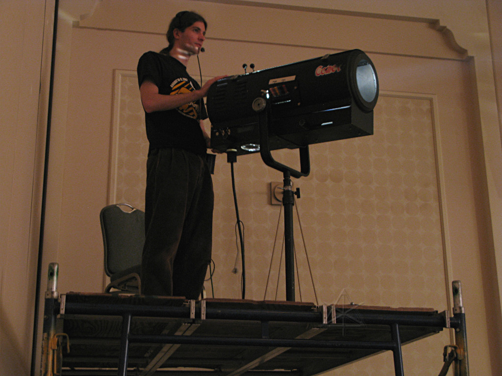 I got about 3 hours of sleep and then got up to undo the club-dance rig and repoint things at the stage, since we had another two days of events to do! That afternoon held the radio-plays in C/D, which wanted some minimal lighting cues so I hung around to handle that, and then the Goth band showed up next door to set up. They had a little "waterfall" effects-light to splash up the wall behind them on the stage, with plain white output, and I offered them some gel to color it up if they wanted. The choice? Deep red, naturally. They seemed happy with that, some very minimal light on stage otherwise, and a fairly dim room overall. |
