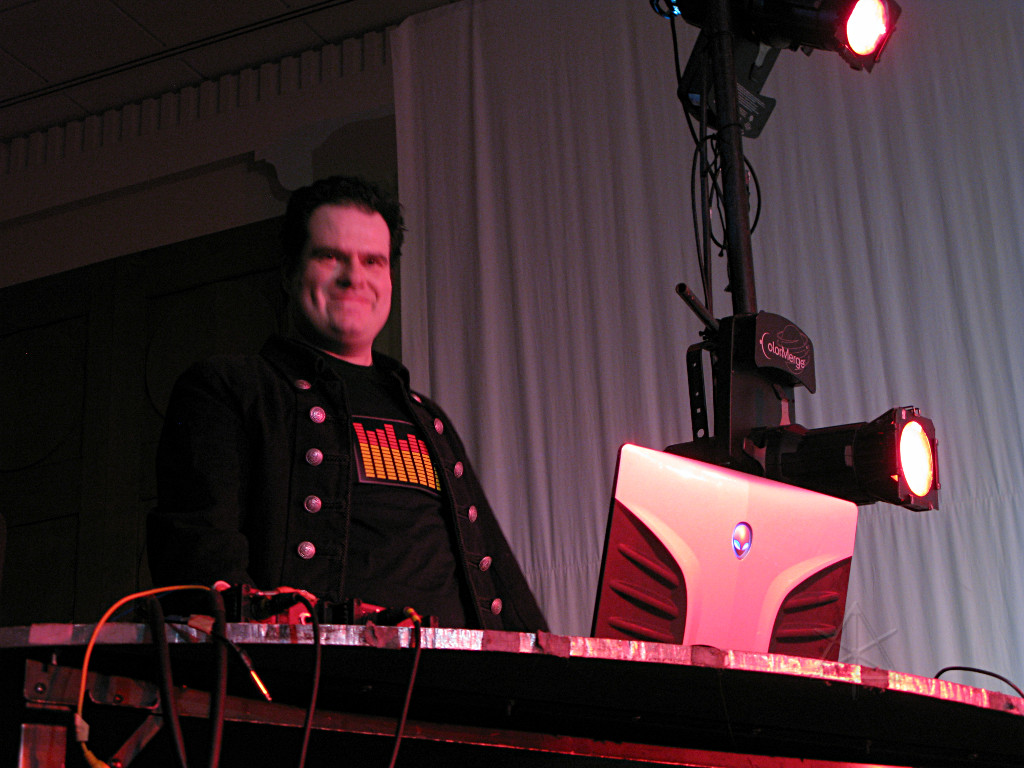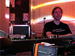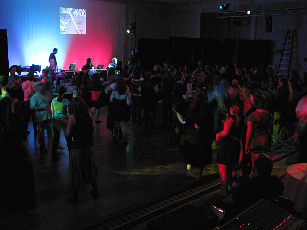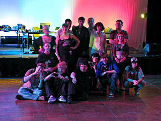 The club-dance itself was pretty much the usual -- I ran manually for most of the peak time, following what Johnny was playing, including having a lot of fun with "Time Warp". With the conventional board and the Hog on an A/B switch for the conventional units, I was able to set up some fun looks on the Lep independent of the relatively random bouncy stuff the Hog was doing, and then swap to that on musical phrases. So the "Time Warp" choruses got alternate shots of *all* the lights from one side and then the other, clearly matching when people did the half-turn jump. I also used it to substitute for the "white-blast" that I didn't have wired this time, i.e. that quarter-second of all lights on [or sometimes off!] right before what's usually an 8-measure phrase change. Otherwise, the Hog was doing everything for the floor and also splitting the cyc colors and using the Colormerges to throw all kinds of lurid colors on different sides of Johnny. At one point the guy who's also the next conchair of Philcon came in with a VJ setup and ran interesting stuff on the back wall for a while. Later when things started to thin out, I threw the whole rig on "autopilot" and went out for a "reality break" every so often, including a short mission to find some interesting libations for which I was very grateful [y'all know who you are]. By around 4:30 AM the floor was down to Johnny's usual die-hards who kept it going until dawn, while I was almost falling asleep into my keyboard over there by then, and he wrapped it up with his 99th song of the evening a little after 7AM. We did a group photo and then got the heck out of there. |