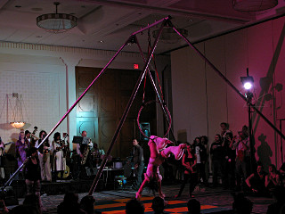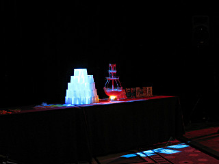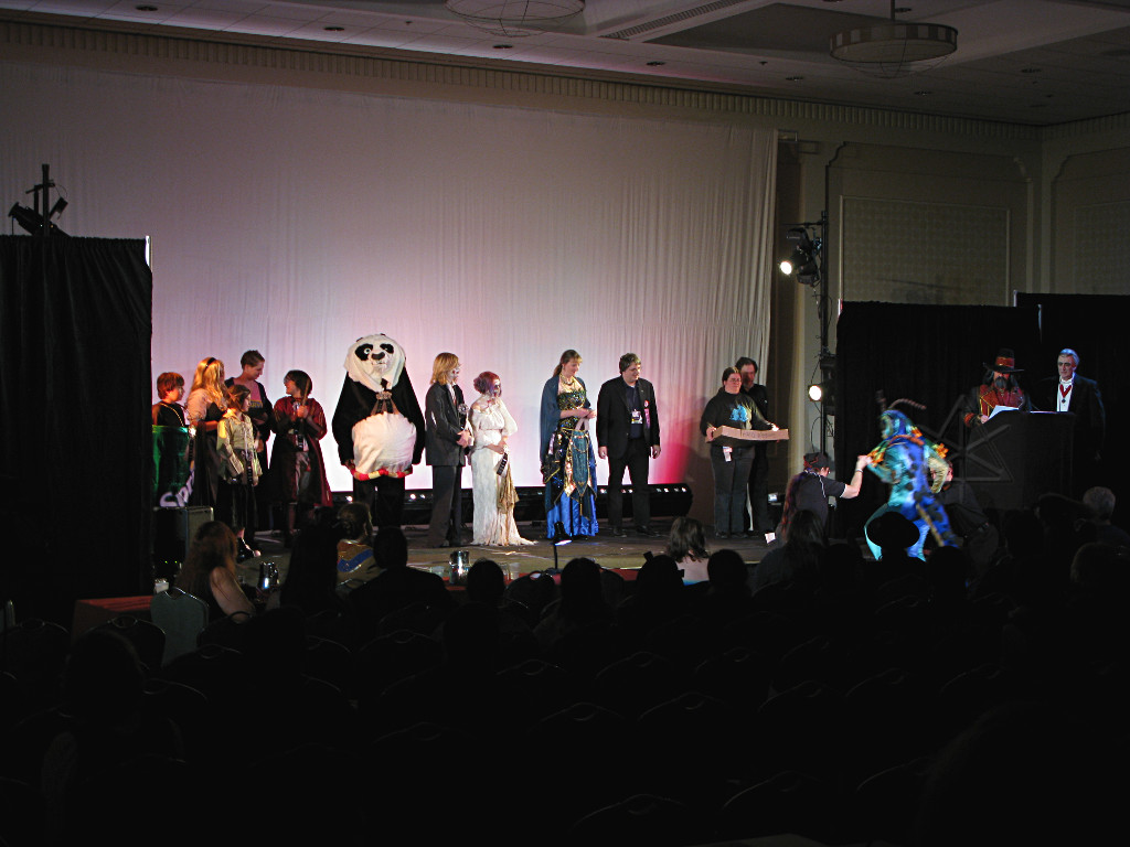I arranged for a "changeable" gobo light near the tech table so different projections could be dropped in if needed, but we only got one special gobo request and because of the nasty drape shadow, half of it had to get chopped off in a shutter-cut anyway. But that was okay because we got a nice spread of Oriental rooftops across the top of the cyc and that was enough to carry the effect. I didn't really get any masq pictures other than one quick shot of the presentation winners, but a straightforward list of Sandy Middlebrooks' voluminous collection [1186 shots!] is here. Grab it while it's hot. |
