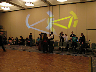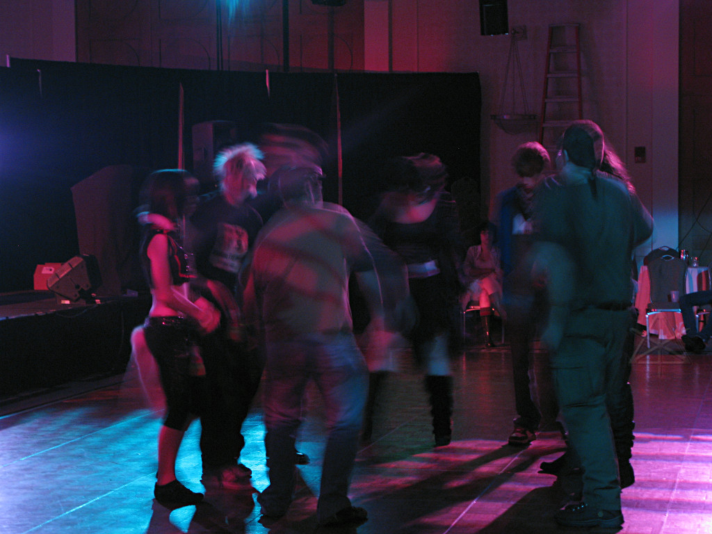 The Cosplay prom was a riot. I had added some "cheezy DJ effects" lights to the rental order upon hearing more of what it would be like, and between those and my mirror-ball with a couple of wiggles pointed at it came pretty close to an old-skool, low-budget prom environment. |