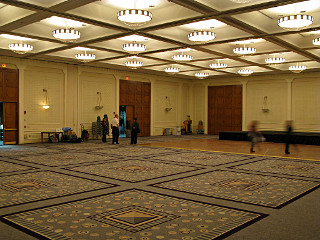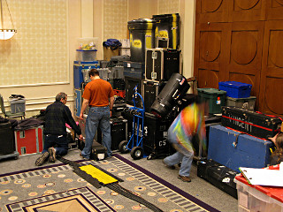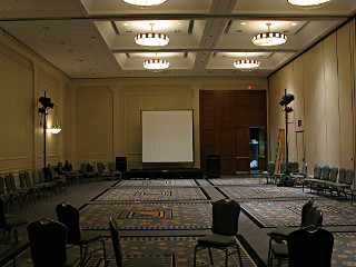 Images all link to larger versions. My first task on arrival was to get the house-lighting presets straightened out, before anyone else was around and needing light to work in the ballrooms. The idea in this space is to *never* use the icky compact-fluorescent top-hat lights, but only the big incandescent-only chandeliers. While perhaps more energy-intensive, the light these give is *so* much nicer and doesn't produce all those high-frequency buzzing noises. And at this time of year, especially this particular weekend, they helped to heat the room. There's a nice map of the fixture circuits taped to the wall near the control panels in the back hallway, so one doesn't have to walk out and check what's on or off. I noted with some amusement that the presets were already set *almost* as I wanted them -- either left over from last year, or set by the hotel A/V folks or other clients as the fairly obvious thing to do. The Swank staff had also bought a couple more IR remotes for the system so we could have independent control from the tech desks in each of A/B and C/D. The only downside here was that the hotel people would occasionally screw with the presets in the course of their own duties, maybe not realizing that they should have used the master up/down control on the back-hall panels instead of the individual "dimmers". They also ganged and un-ganged the rooms on me in odd ways, which there was no reason for doing. Perhaps we should have taped big fugly signs over the panels like Val did last year, to keep meddling hands out of them. |