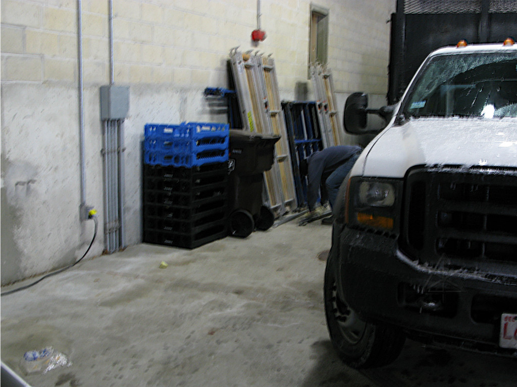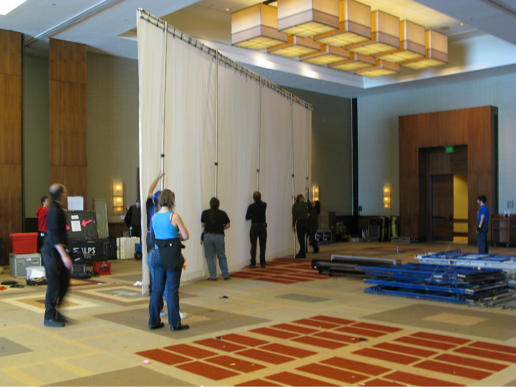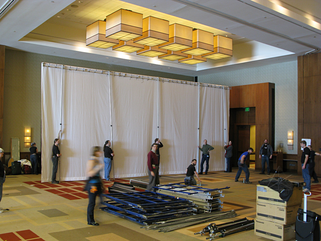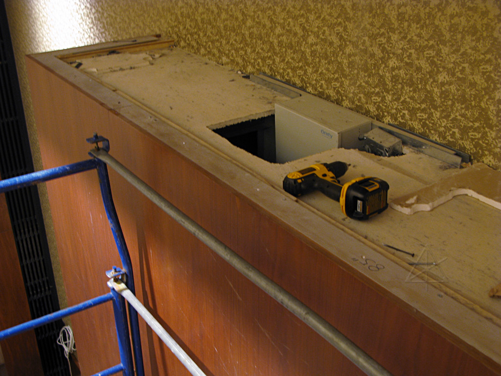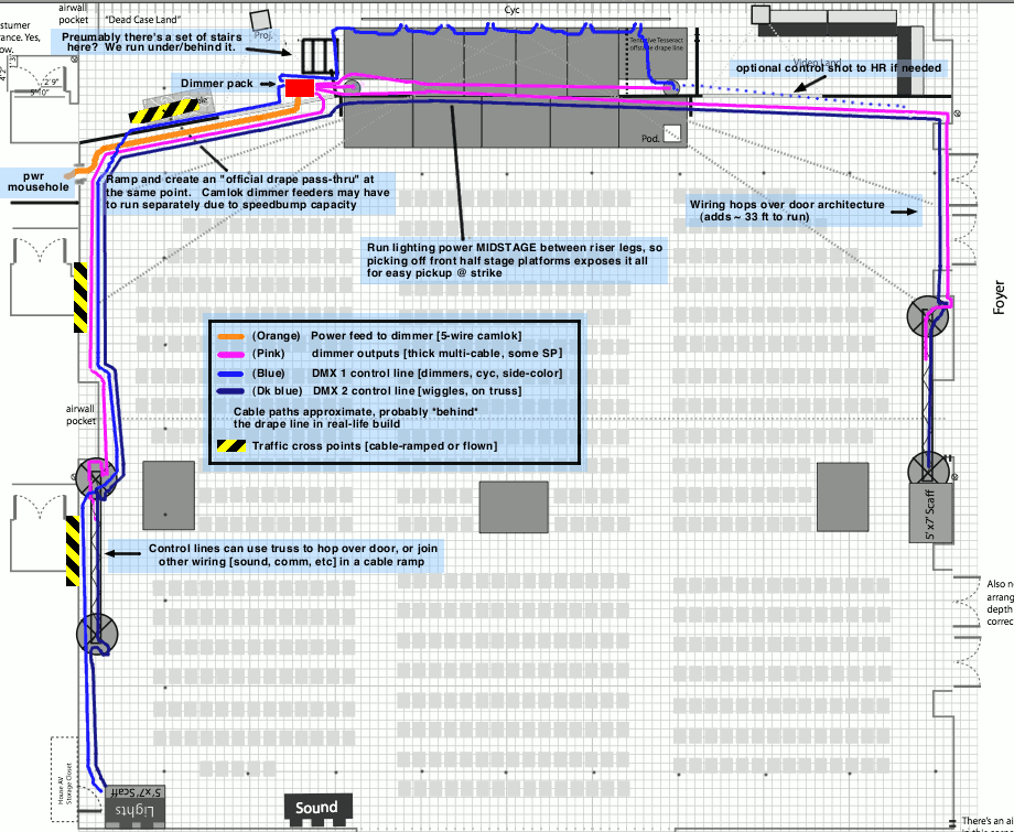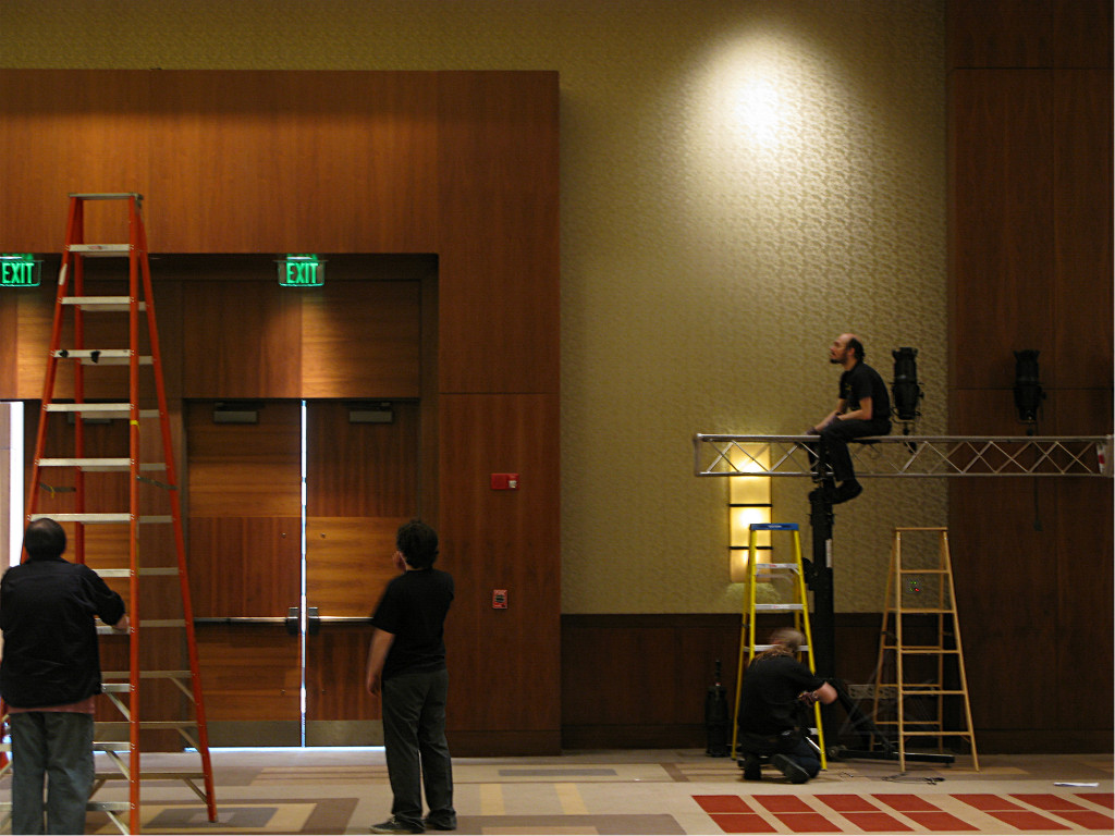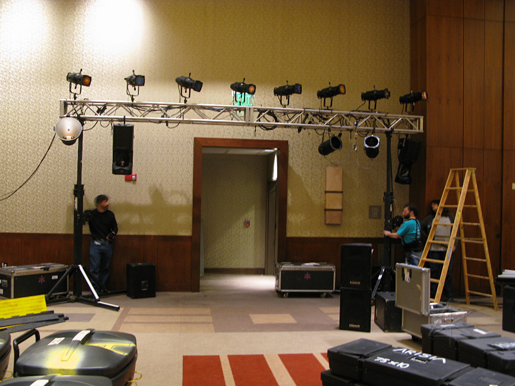 Here, however, we seemed to be contemplating the problem of passing wire over that huge piece of doorframe architecture. It's over 16 feet high, but is clearly the right way to get cabling past the traffic point without running on the floor. The modified layout and additional length has been documented in the post-con diagram making it easier to plan for this hop in the future. To connectorize that piece of run, it turns out a 50-foot cable will hang a couple of feet from the floor at both ends and conveniently connectorize the segment. In the case of the lighting stuff, the ends could just drop right onto the truss. |