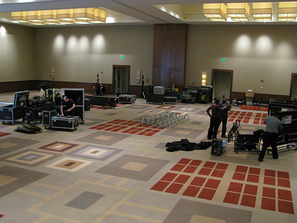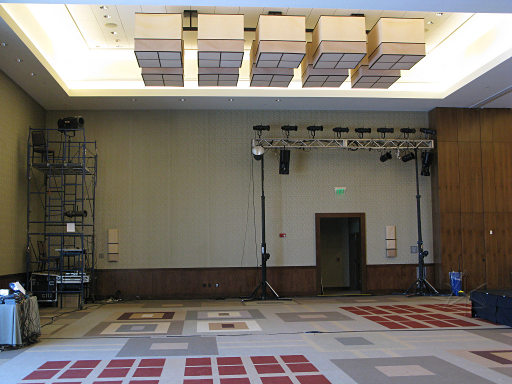 The backdrop texture, of course, was from glass lenticular gobos in the Martin 918s. These took a decidedly secondary role this year, as the whole club-dance event was in an entirely different space on the other end of the hotel and other than me renting him some infrastructure basics, was handled soup-to-nuts by DJPet and his vanload of *very* fun toys. My only mild shadow problem came from the throw of the wiggle-lights which couldn't be shuttered to avoid hitting the side trees in a "cyc spread" position anyway. But for random textural add-ons, who cares. |