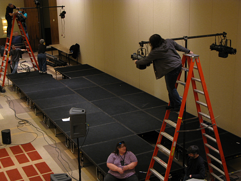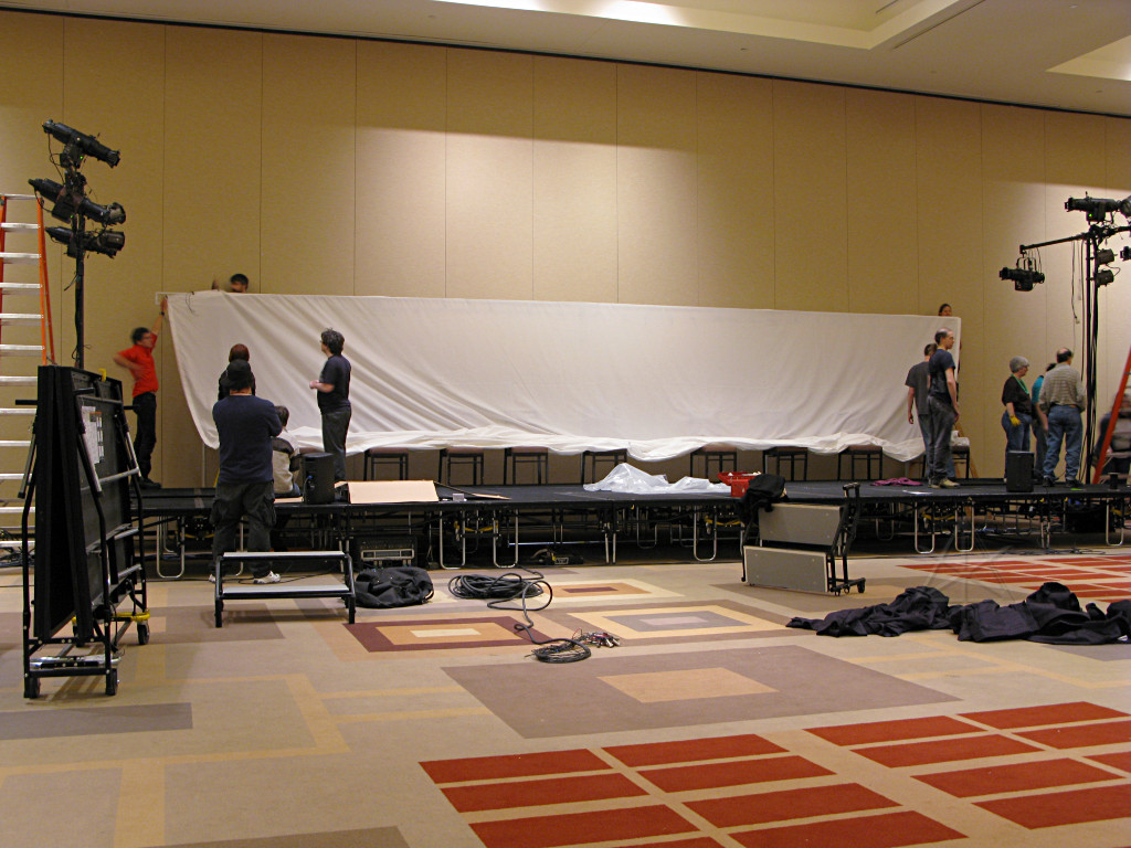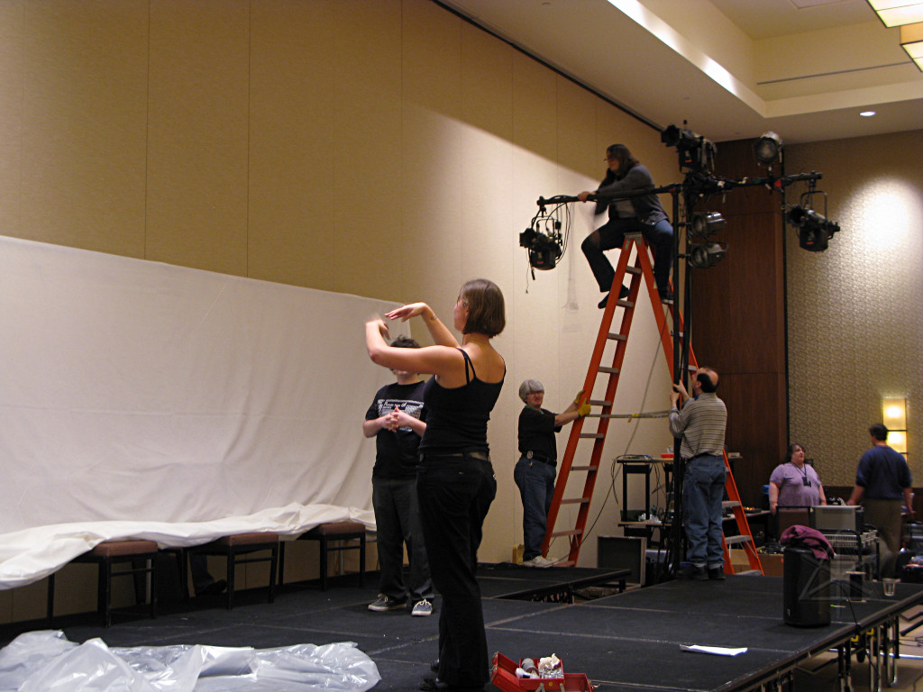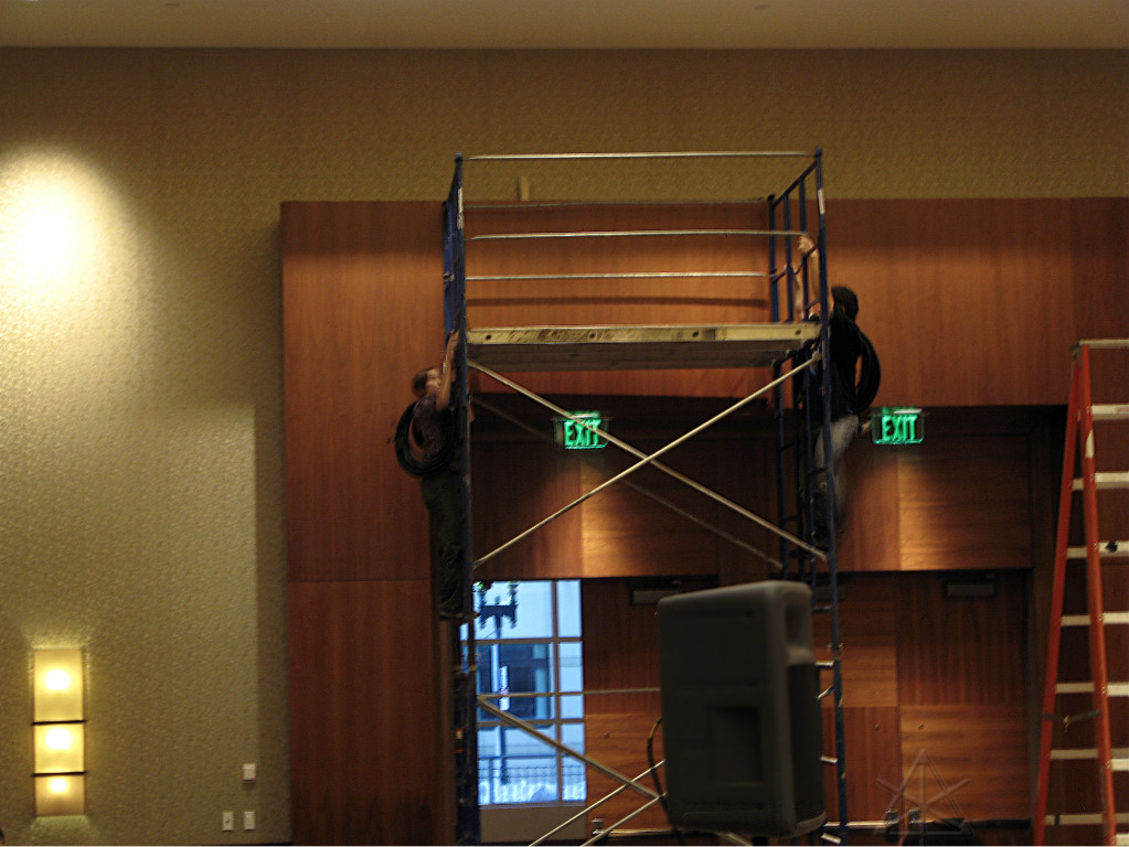 Close examination of the scaff on this side reveals a very ghetto lashup to accomodate what became the lighting-control booth. Two stacked tables, and a third thrown in across a cable trunk [where it wouldn't sit flat] for the chairs. It all barely fit in between the X-braces but was actually fairly secure. Why wasn't this just on a mid-level set of work platforms? Because some collective of myself and the Arisia finance department screwed up and failed to actually make sure to order them, and I didn't catch that fact when the delivery came off the truck. So neither scaff could have a mid-level. But we made do, including building a little temporary throne for the masq show-caller on the other side. |