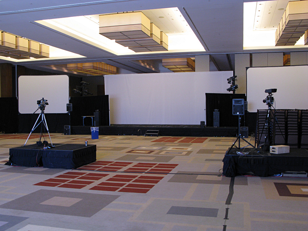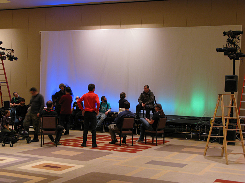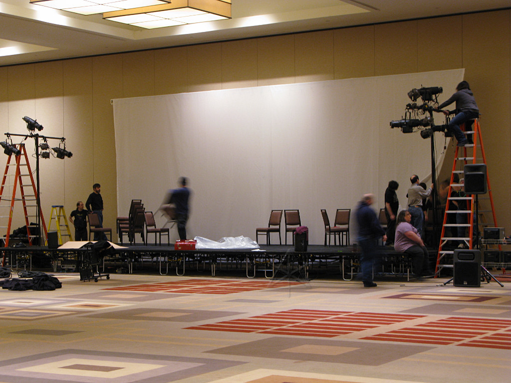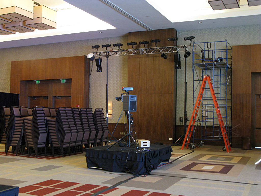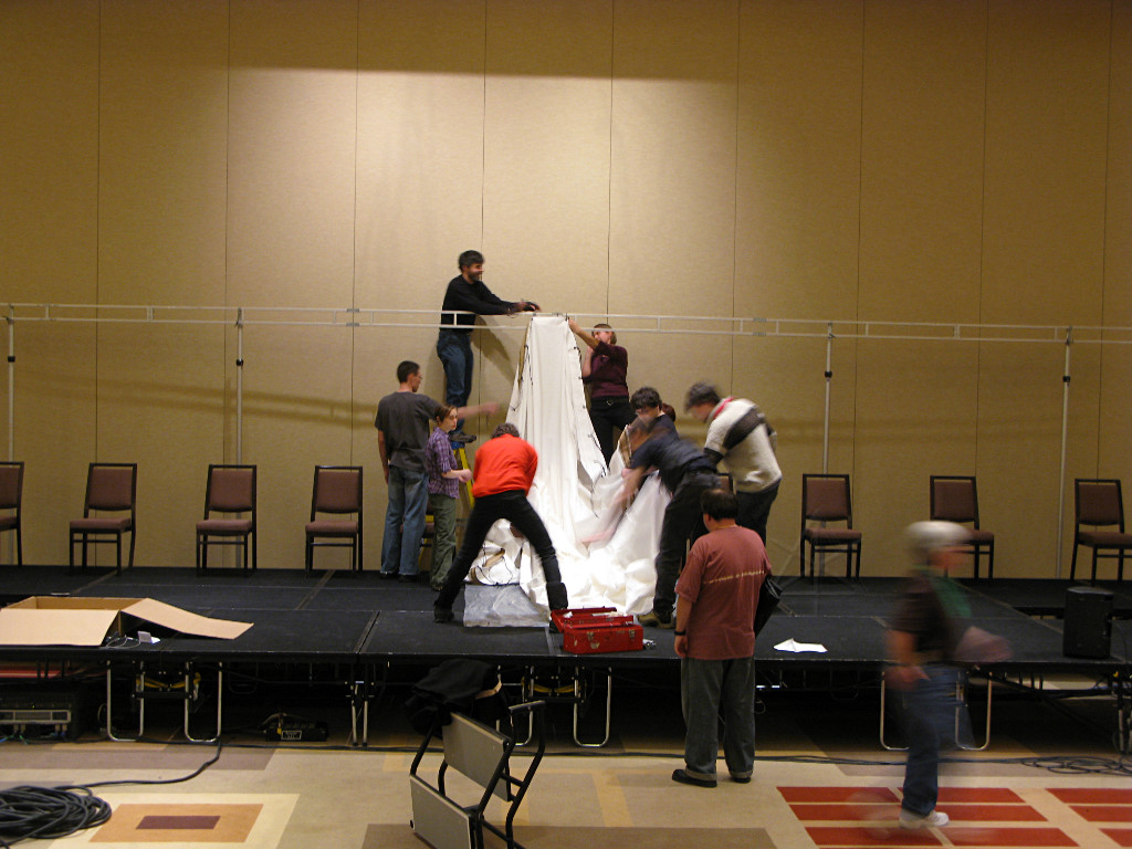 Close examination of the scaff on this side reveals a very ghetto lashup to accomodate what became the lighting-control booth. Two stacked tables, and a third thrown in across a cable trunk [where it wouldn't sit flat] for the chairs. It all barely fit in between the X-braces but was actually fairly secure. Why wasn't this just on a mid-level set of work platforms? Because some collective of myself and the Arisia finance department screwed up and failed to actually make sure to order them, and I didn't catch that fact when the delivery came off the truck. So neither scaff could have a mid-level. But we made do, including building a little temporary throne for the masq show-caller on the other side. |