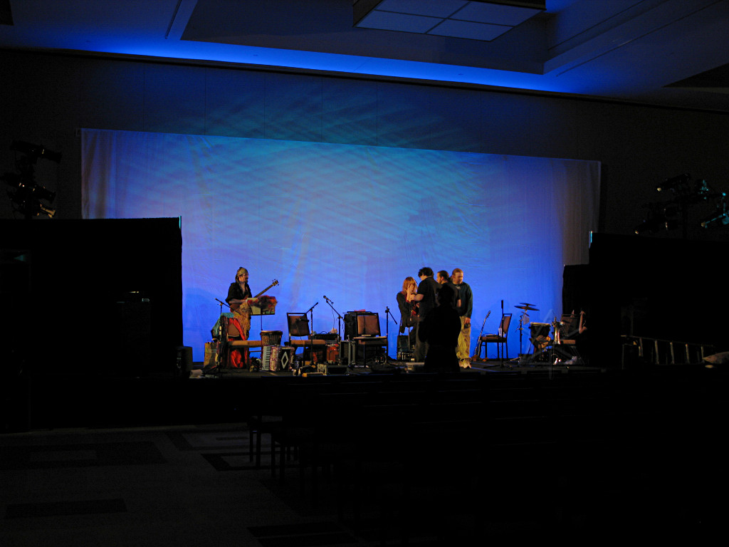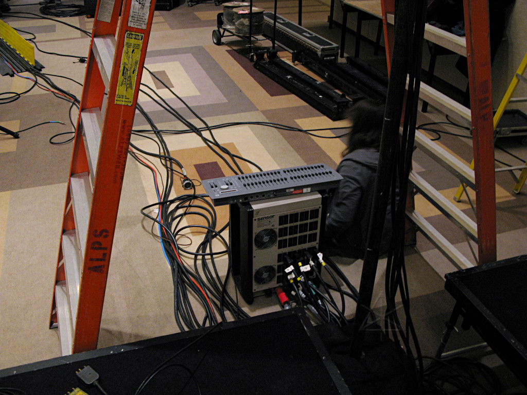 While I took almost no pictures of the actual events, here's one example of how well my intentionally "sidelight-heavy" rig worked -- playing with some looks as Faebotica set up on stage. I could have any color on the talent from either side, and the cyc looking *completely* different as the sidelight didn't touch it. Add a minimum of face light, barely visible on the backdrop but enough to round out figures, and I thought it was a nice stage picture. A very careful look here reveals where the main warm/cool washes cross through the drape gap and intersect, and to either side the rounder output of the additional "shadow-killers" from fresnels on the side pipes. There was an almost non-noticeable color shift between main and "killer" only on the warm side, but with everything else up there was no way it would start being an issue. And no shadows of the *side trees* themselves showed up on the cyc via the main wash, which mildly bit me last year -- this time we pulled 'em far enough back to really work well and integrate with the rest of the rig's intentions. Straddling the drapeline has many merits. |
