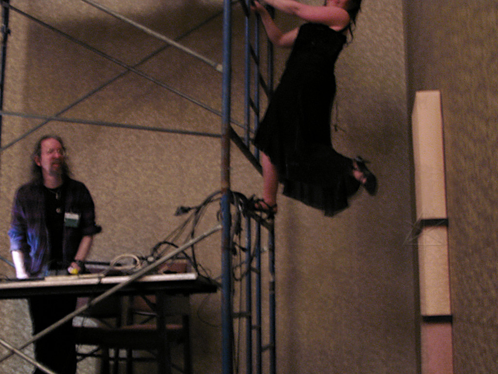 Teseracte's performers double as crew as needed, so sometimes they just have to climb scaffold in dress heels. I wish I'd gotten a better shot of this, as it was all rather funny. |