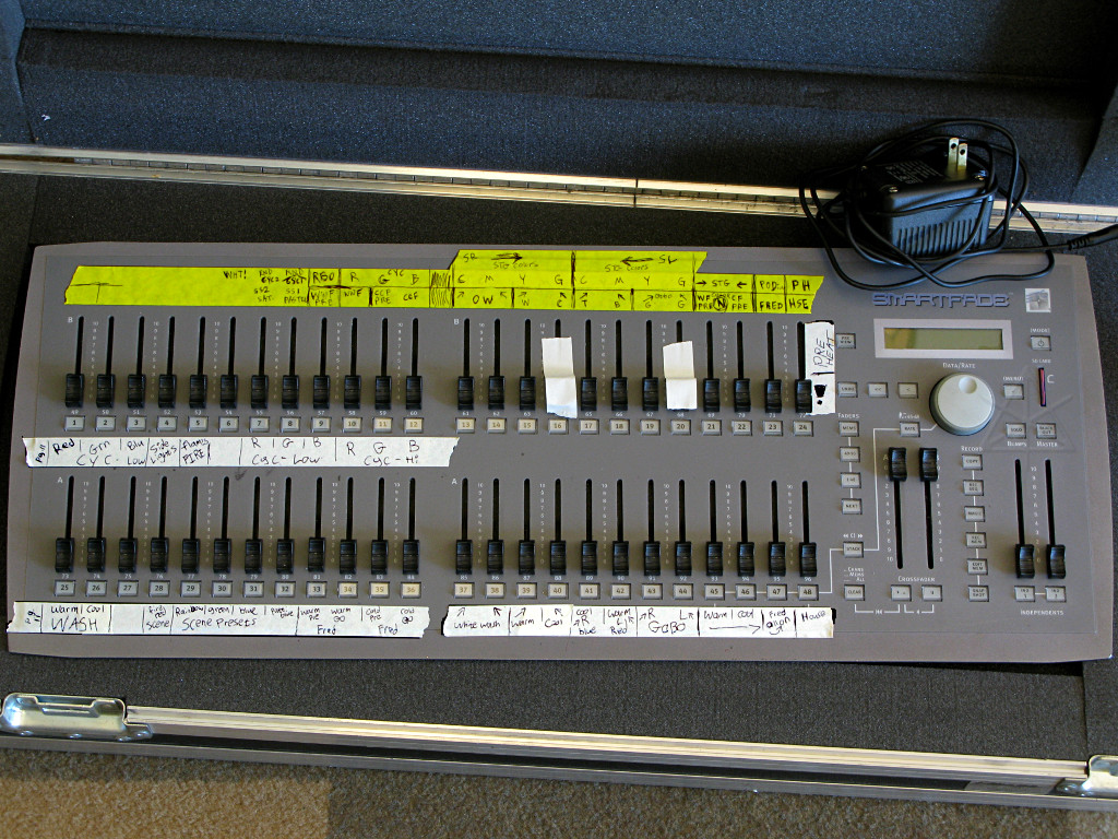 The Smartfade represented a bit of an experiment in terms of control for the events we were about to do. But at this point we only needed to test rig functionality; I set it up on the stage so a single person could check channels just by looking around. |