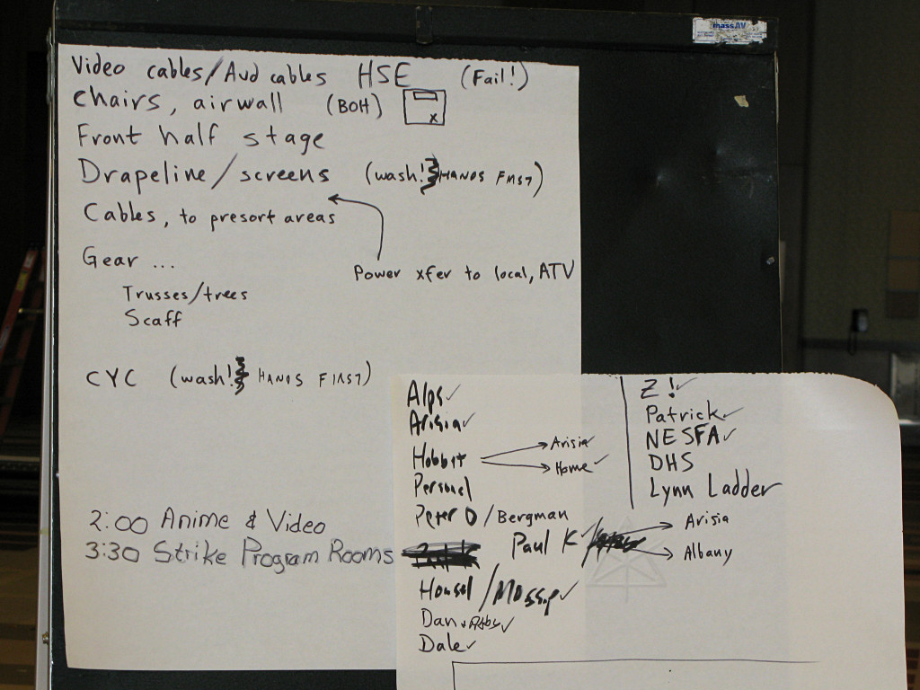 While I would really love us to be a really crack crew with perfect workflow, solid communication, and gracefully-executed high clue all round, this is volunteer labor and it's just not possible to be selective. Some of the folks who show up *are* really good, and that's how stuff gets built quickly and right. But in every group there are invariably a few slackers and drones, sour notes that consistently ruin the symphony of technical production for the rest of us. Perhaps, after I don't know how many years now, it's time to face this problem and solve it. The fact that I'd even bring any of this up in the middle of a rundown on an otherwise fun weekend should speak volumes about why I could never be an effective TD, but if the deeper particulars of this are interesting in the slightest they are held in a separate rant which is likely to come off a little harsh. You're warned. |