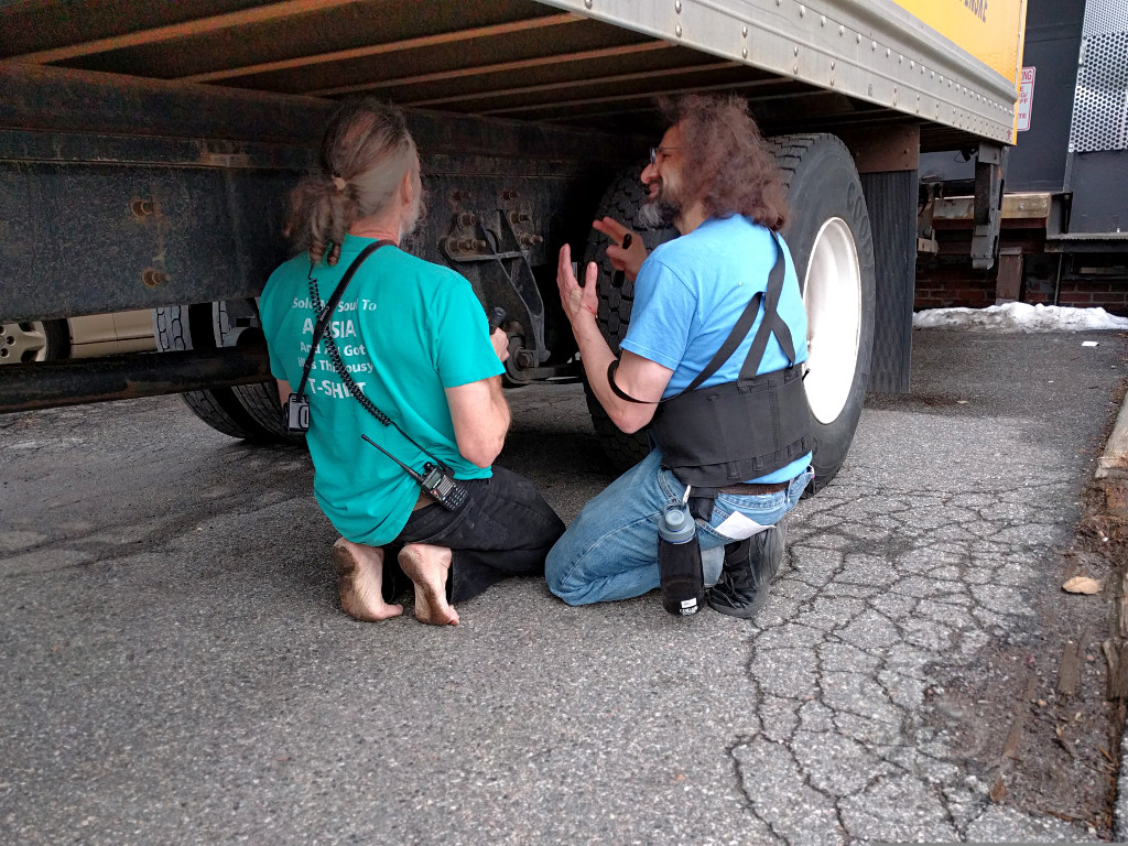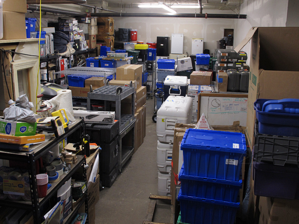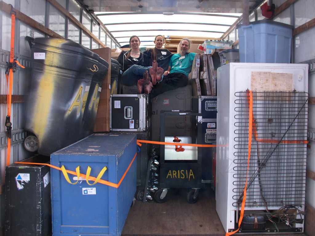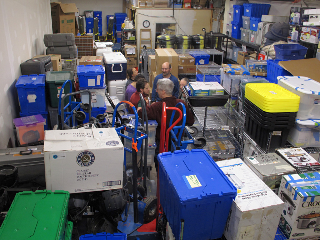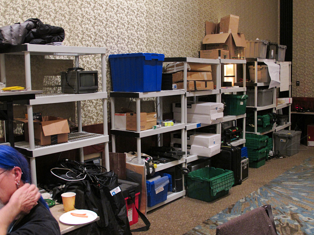 Many Arisia members have no idea what makes our backend infrastructure work. For all they know, magic gnomes set everything up in the middle of the night and poof, the next day there's a con. I was made aware of an amusing chat between a mainstream attendee and one of our crew, and given a transcript, which is a fine example of what happens beyond the cognizant scope of most people who come to Arisia. ## Chat Log excerpt, Tuesday, January 10, pre-Arisia 2017That last point about shipping containers is almost well-taken, except that it would be impossible to pack gear into those and still be able to rearrange things pre-con. And it would still need to be in climate-controlled storage. But this year we had worked a little closer to a "pod unit" concept for some departments in the form of the rolling Metro shelf assemblies with bins stacked into them, and we were about to see how that would work out. I made sure to advise people moving those that any lifting of such units needs to be done by the POLES, not the SHELVES, to make sure that a shelf doesn't pull up and release itself from the little plastic wedges. If it's shrinkwrapped, it's okay to punch fingers through that to grab around a pole -- the wrap is going to come right off again at the destination, so minor damage to it along the way is fine. The fun begins! One of the usual hard problems is how to move our helpers around in the process of renting trucks and getting crews to follow them around for loading and unloading. Besides a passenger or two in the trucks, the usual answer is to pack them into available cars -- but *whose* cars, and how can those cars be kept easily available in non-optimal South Boston parking conditions? Never any really easy answers here. With this year's logistics heads living in the north burbs it was determined relatively convenient for them to pick me up on the way in Wednesday morning, heading for our friends at Enterprise commercial truck rentals in Chelsea again. Meanwhile Rick, who had been handling mountains of stuff at NESFA and was sort of back in the loop logistics-wise, picked up the second truck from Penske. We used *three* different truck vendors this year, which seemed more complex than needed but someone else was handling all that paperwork. For the "out" we'd evidently decided to take advantage of the fact that the Ryder yard is within walking distance of the hotel. A major factor in getting enough load-crew volunteers is that the timeframe for main load-up has shifted much more into the daytime on Wednesday, simply because we have so much gear and we don't want to be working until 2am when people get tired and stupid. But finding enough people who *can* be available from about 10am on a pre-con weekday is tough. Many folks who would otherwise love to help are at their day jobs, and might arrange to take any of Thursday/Friday off to start helping build their con, but Wednesday is important because we need to have *filled* trucks to unload when we get our hotel spaces on Thursday! Previous years when the activities began around 5pm often turned out far less favorable by comparison. Since I'm able to help in this regard, I generally do. |