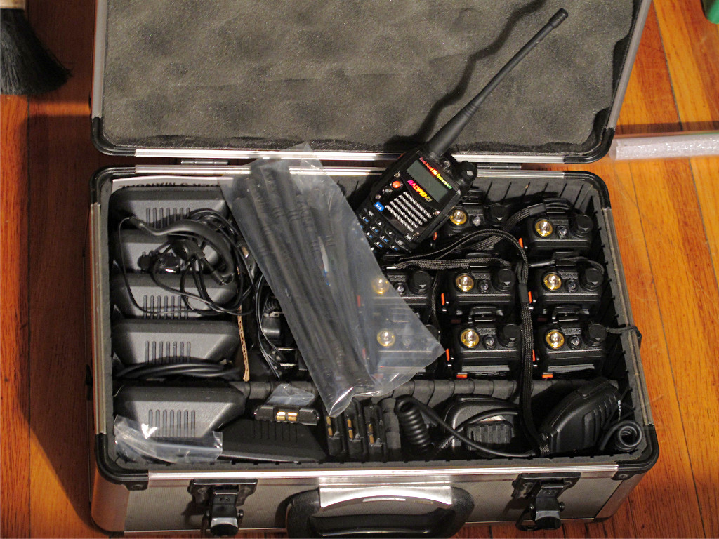 I had included a brief but heartfelt rant at the end of last year's report on the potential benefits of having good quality radios available for logistics and tech work. I kept pushing that point over the intervening year, and it turned out that Gela had gotten more into event radio support in general and had built up a very nice little kit full of Baofeng dual-band units. We tested these across the hotel during one of the concomm meetings, and found that UHF on 4 watts could connect between pretty much any pair of areas we would be in around the hotel. We didn't test them long-haul between different places outdoors, for which VHF might have been better, but they could cover our most important scenarios without needing any repeater infrastructure. She passed the whole kit off to me just before all the truckin' fun started, having bulk-programmed up a few simple business-band itinerant frequencies as selectable channels. |