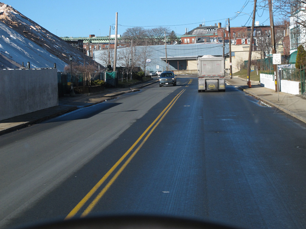 Rather than getting what would just be a duplicate of last year's shot from Marginal St, I waited a little longer to spot this dump heading out with a load of salt bound for some far-flung municipality or the like. But with no impending storm warnings on the way, truck traffic along here was significantly lighter than I'd seen in past years ... I didn't have time to stop and admire the Eastern Mountains in any detail today, but noted there are some weird formations along some parts of them and maybe it's worth going back for a more leisurely look and photo-study. |