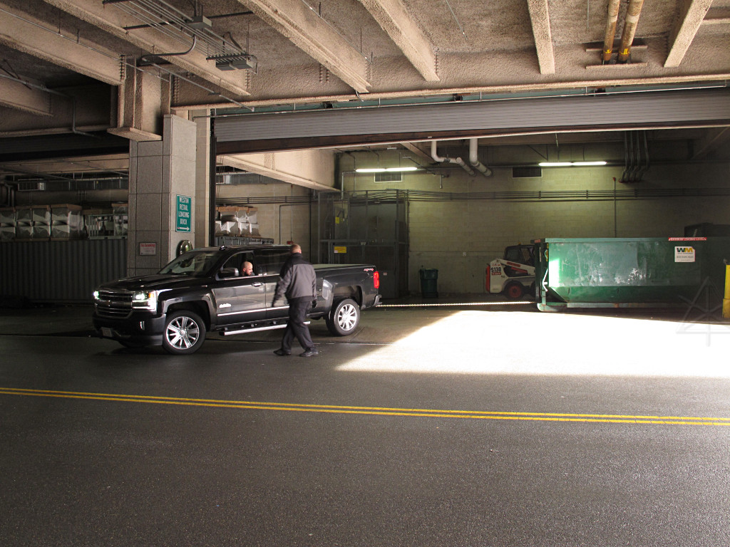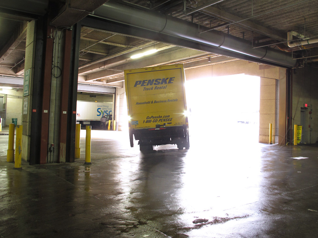 The landlord's white sedan parked in next to the dock never got removed, and in fact had apparently been sitting there for *weeks*. Maybe it was dead. My plea to Corporate for a way to contact him fell flat, so we simply wouldn't have the luxury of pulling both trucks in together. My "curb ramp boards" were thus useless, and could simply go back home that evening. |