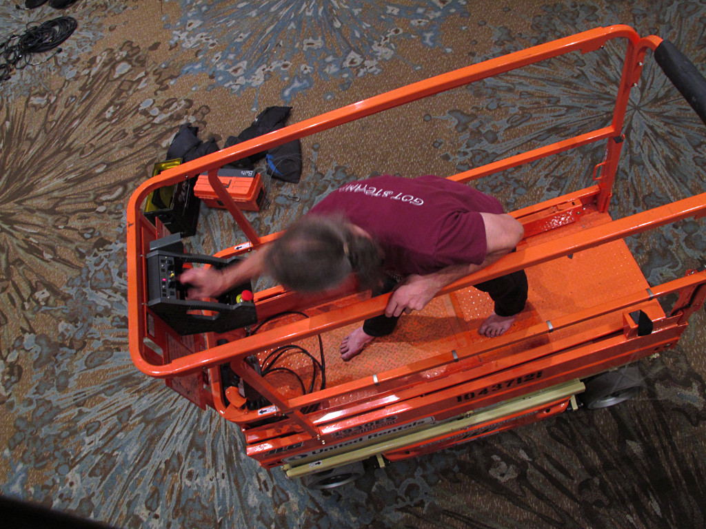 [Just as well that I wasn't on that whole shift, I guess, as the tech crew was still under orders to play the same meaningless charade with PSAV again -- despite that their guys on the ground have certainly known about some of our working preferences for years and are fine with it. Personally I hate trying to work in china-flats, as they *hamper* my agility and I won't even try to do any complex climbing with them on.] |