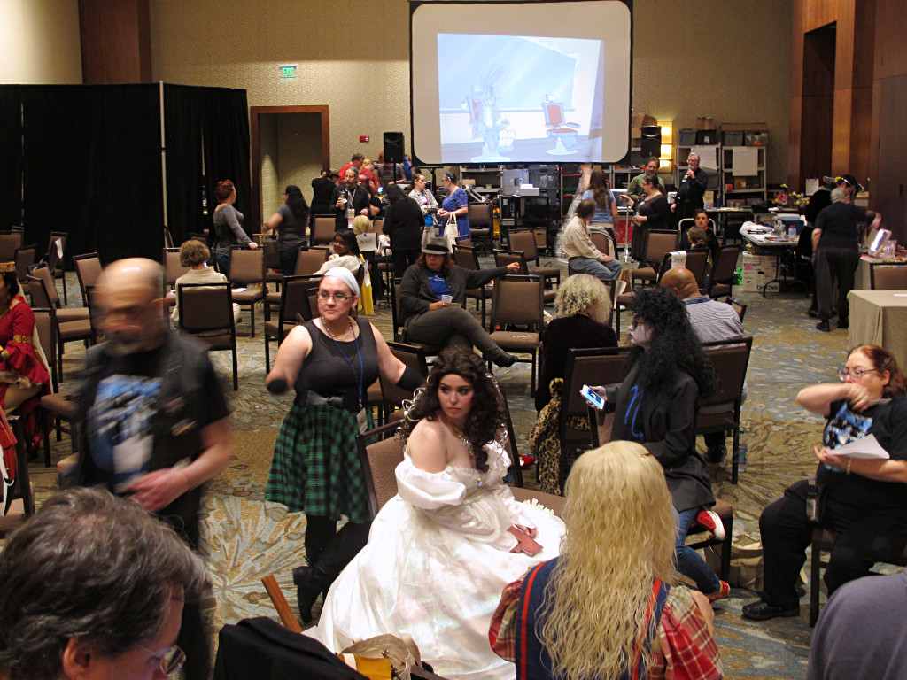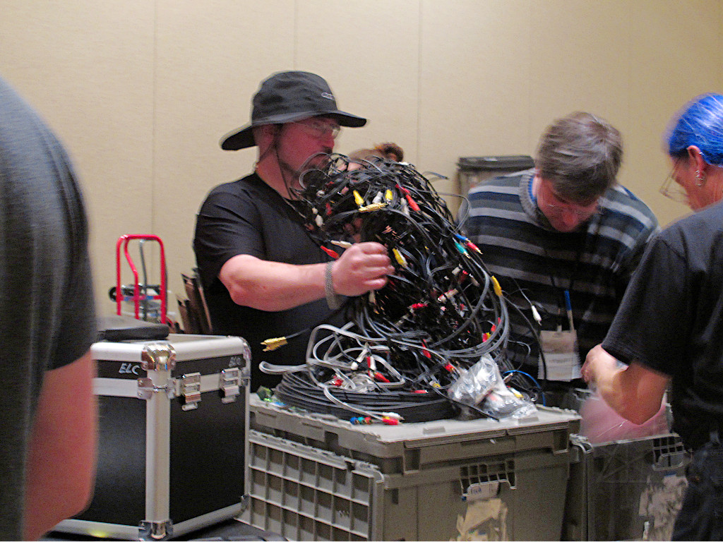 One item that I needed to retrieve from Storage was another batch of intercom gear, to add to the inventory I had reconditioned the previous year. Jim from NJ was selling out his production stock, and it made sense for me to continue being the Keeper of Intercom in general. This batch needed similar vetting, although it was generally in fresher shape already and didn't need de-molding or full DeOxit treatment yet. Unfortunately, most of the headsets in this batch are the newer but flimsier 310 family from Production Intercom, on which the mic-boom swivels tend to irreparably break under minor strain. And the included pair of older but much sturdier 210-class headsets both had, rather astoundingly, dead microphones. How do you kill those?? Simple uncaring abuse by unskilled volunteer "helpers", said the prior owner when I ran into him later at the con. In the short time I had to go through thise gear I pulled out eight working station/headset pairs, including one more dual-channel box, and that was enough that I could supply the whole wired ballroom setup without needing to augment with anyone else's gear or get into major repair here. |