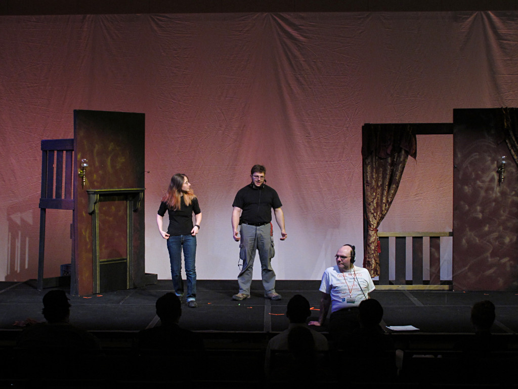 I took a camera-op position for one of the "Mrs. Hawking" runs, which made it a little interesting to try and keep track of the plot while watching most of it through a 4-inch monitor with one ear covered. But this group is fun to work with; they're very dedicated and energetic, and put on a high quality production without much help/intervention from our crew. They build and move all their own sets, and getting their lighting sorted out was all of 15 minutes of their production manager sitting down with Daniel to whip up and record some scenes. It was interesting to listen to their intercom chatter during some of the show runs; their cueing is tight and accurate and their backstage folks were clearly adapting competently to our stage environment on the fly. |
