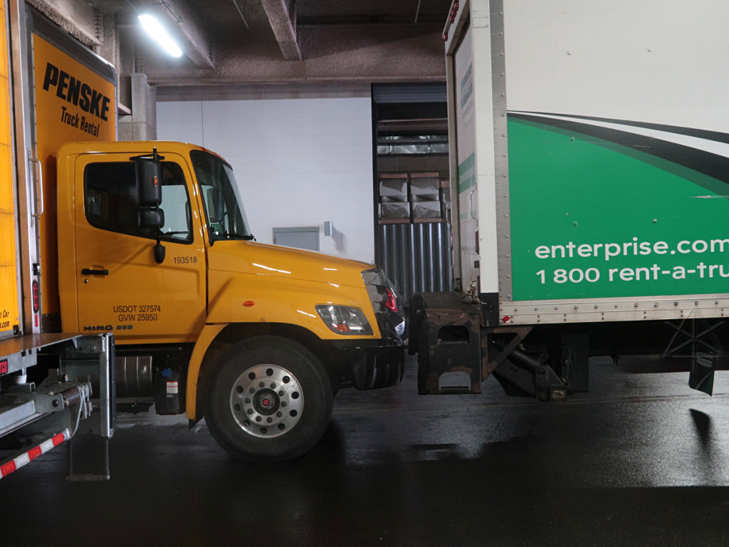I wormed in past not only this full-size semi, which was indeed full of mattresses getting delivered upstairs, but there was *another* one just as big waiting out on the street.  On the dock, guys were busily rolling them out two and three at a time, but it was still sort of slow going to deliver them and they estimated that each trailer was a two or three hour unload.  So basically one bay out of two would stay jammed solid all afternoon.