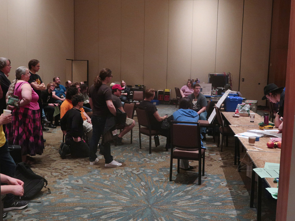 Tech meeting Build continued the next day, and as the actual start of the con neared we had the second tech meeting.  Roles for that evening's events were assigned, and remaining tasks reviewed.  It's good that we hold these, if for no other reason than to help lock people into specific roles in advance, because otherwise it would either be a scramble to find someone who could deal with them or wind up having a small number of people trapped in function rooms for hours on end.  We always have a large set of runtime positions to fill, and expect people to trade off to the extent they're comfortable with.  Even with the meetings it's sometimes hard to get people to take jobs -- they're either unsure of their own abilities, have other things to go see, or are just plain tired of doing particular functions over and over.  I didn't volunteer for anything in that night's block myself, because this year I had a slightly different agenda to attend to.