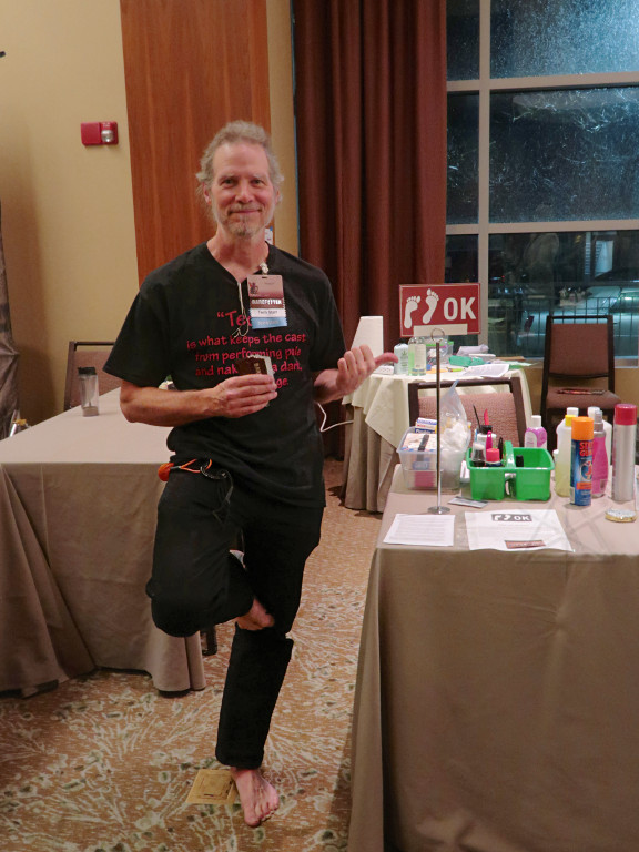I set up camp briefly near the growing registration line, also bringing the box of wireless intercom packs and batteries and DeOxit so I could clean them and load them and get other useful stuff done while talking to people.  I could chat about barefooting or intercom geekery or anything else of interest, and in fact felt far more publicly "social" here than I usually ever get at cons.  Hanging by the registration line, a chokepoint that everyone has to pass through, is also a great way to see and greet people you already know.