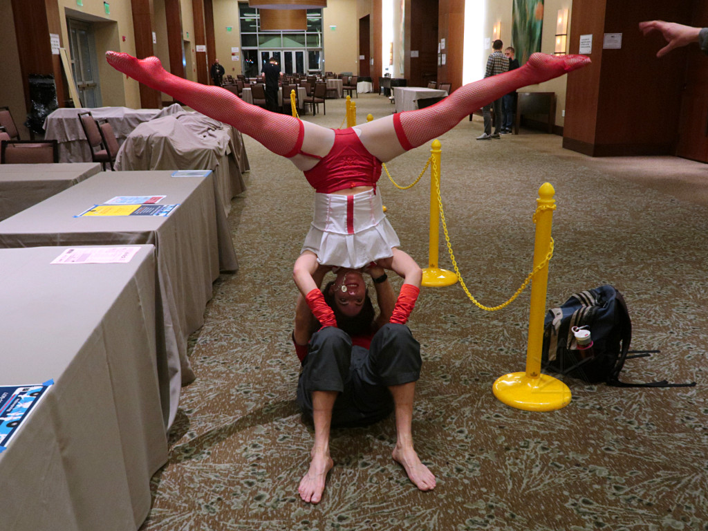Hallway acro Registration finally ramped down for the night and things settled into the late-evening events, with relatively few tech demands.  It was time to go wandering for a bit, to pop into the Art Show reception and go spin some LED staff at the drum circle.  Others decided it was a convenient time to practice some contact acro. All good fun, but that was enough playing around for one evening....  It was late, time for bed, and then back to real work the next day.