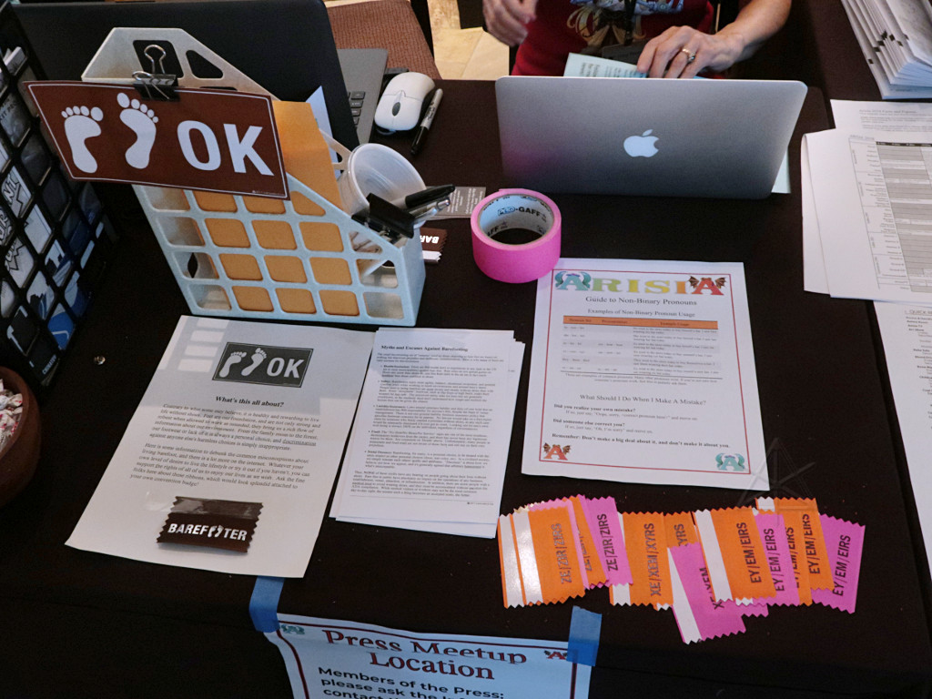 I saw quite a few pronoun ribbons on people, but it felt like they'd had their heyday for a couple of years and weren't such a big deal now.  While it couldn't hurt to bring my stuff back for 2019, if for no other reason than to have a little continuity, this year's message was clear and powerful.  The presence and propagation of barefooters and advocates was far more visible than I had even hoped for, with ribbons on many badges, people asking for more, and lots of happy unshod feet freely and confidently wandering all over the building and *not* getting dinged for it.  Exactly as it should be, always.