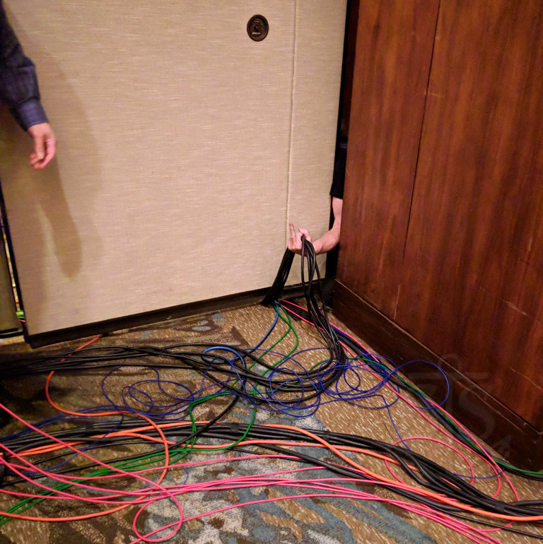 What I never got a picture of and apparently nobody else did either, was the absolute *rats nest* of a power distro that PSAV gave us to split out 18 or so single circuits.  The nice PDU rack that hotel engineering used to give us had apparently gone off-property after PSAV took over, and what they had now was a smallish box with cams in and three-gang breakers and a bunch of "TL5" twistlock outputs to present three circuits each -- then feeding a clutch of their three-phase distro boxes through a tangled pile of the flat cable that they like for running under airwalls and across doorways.  This then had to get broken *in* to the Socapex feeding up to the truss, leading to a whole 'nother layer of high-power spaghetti on top.  It was something of a horror show, and made for a lot more stray noise once various sound and other signal cables got run past it.  The flat cable isn't internally twisted, and probably radiates AC fields very differently than typical round 12/3.
