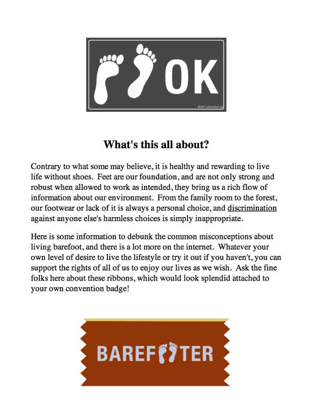 Barefooter ribbon order Many Arisians want the barefoot preference to cease being some kind of "issue", because frankly it's simply *not* an issue.  It's a healthy and harmless part of who some of us are, both within and outside of the convention.  To that end, over the summer I pursued some ideas for bringing better education and visibility to anyone interested.  This included creating a batch of badge ribbons as a grassroots token of support, using the same awards company that all of our other ribbons come from.  I also reached out to some known stronger sympathizers to try and bring them on board with the effort, at the possible risk of boring them silly with my long-winded verbiage [callously denigrated as a "manifesto" by some, apparently].  It was a pleasant surprise when a side discussion came up at the first concomm meeting, *not* started by me, to the effect that we all desperately wanted this to be a non-problem on all fronts.
