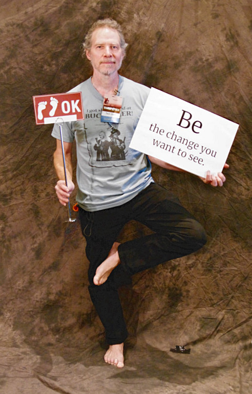 Being the Change That, in fact, was a great theme for the Photo Booth which was right next to us.  I didn't pay much attention to it as it seemed to mostly be about costumes, but then some of their people offered "want a picture?" and I happened to spot the completely appropriate sign among their selection so I went for it.  Doing the one-foot thing again, as I've taken to doing frequently when I'm just standing around, just for the balance practice.  It took a while post-con to eventually find the shots, somewhere on Page 18 of the set, which seems to be a bit chaotic and span multiple years.  That's probably Flickr's fault.  The best of the lot seemed to be this one, but needed a bit of fix-up in post so my rework is the thumbnail and larger image shown here.