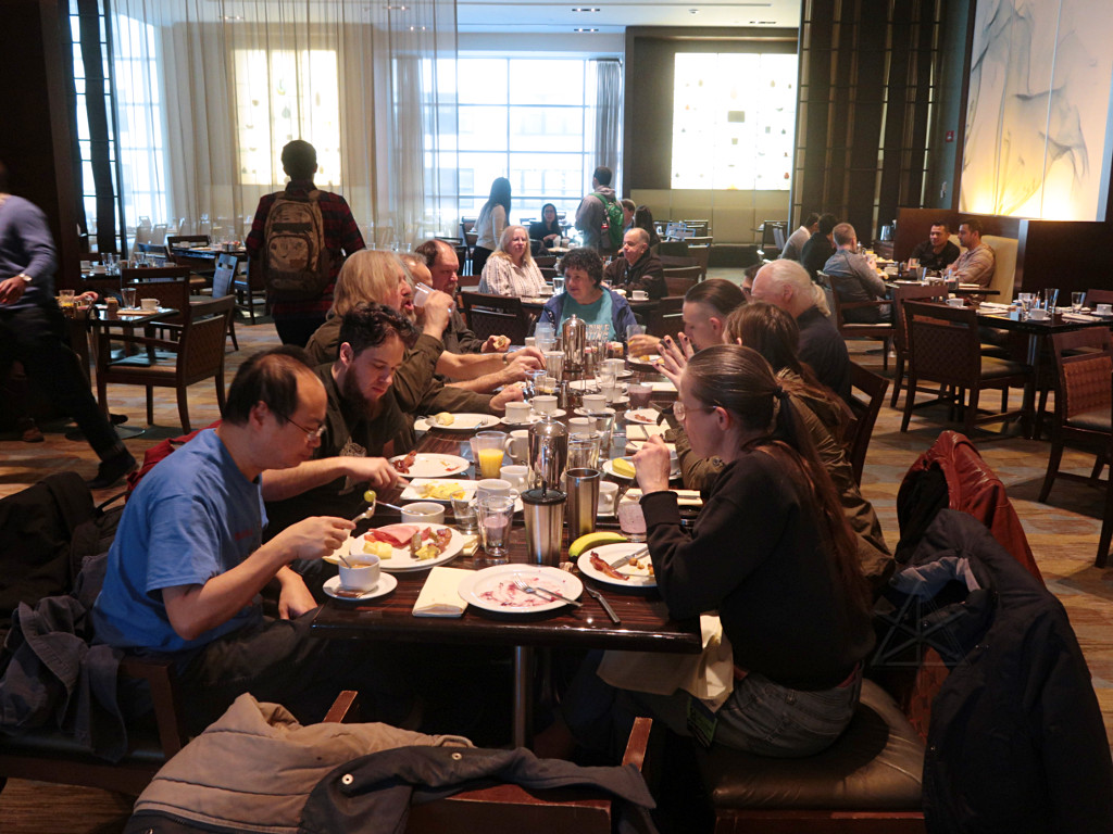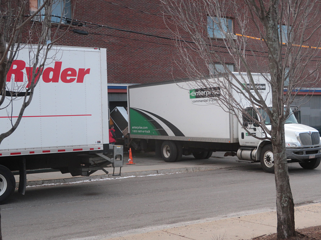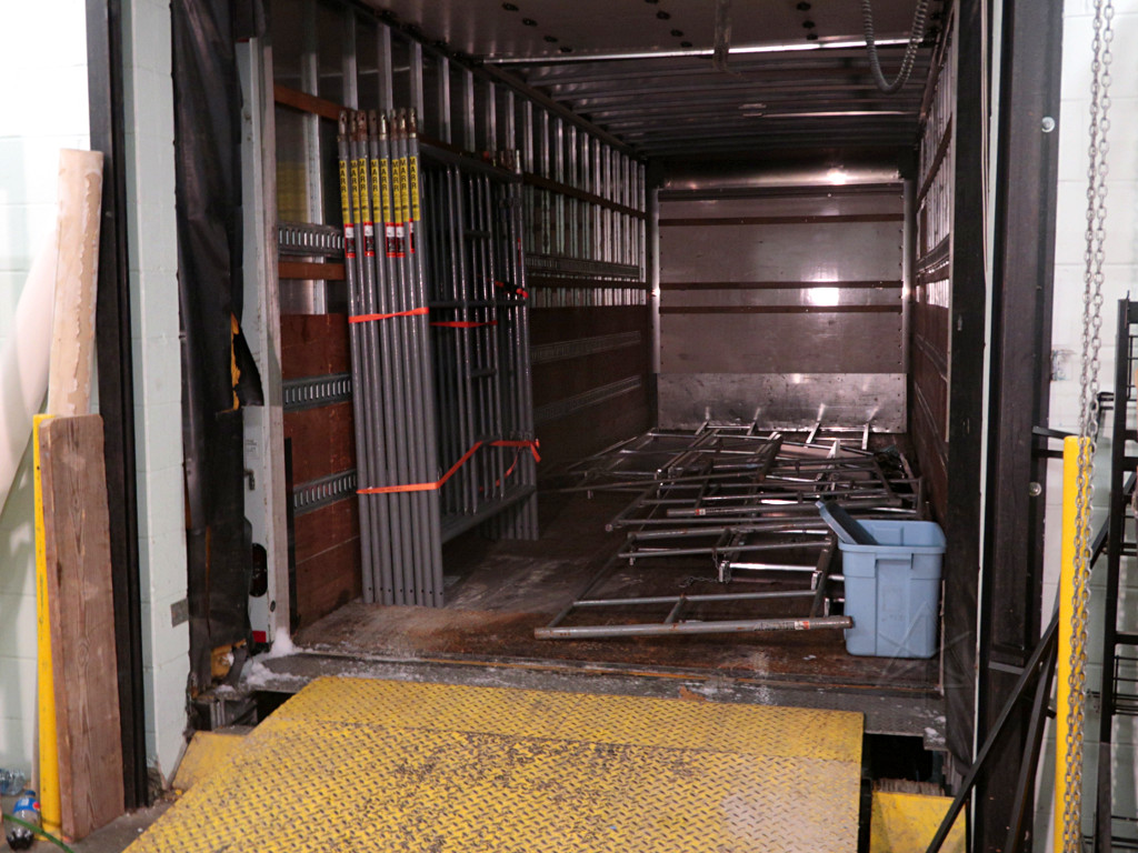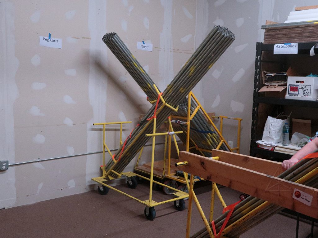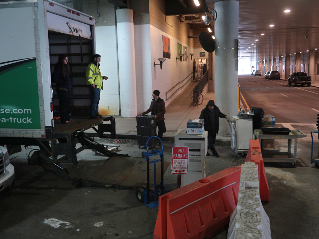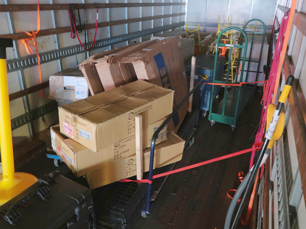 Returned from Main Stage "Works OK but muff is very uncomfortable"Well, yeah, some of the ear padding is on the old side, and getting a few new muffs has been on the to-do list for a while now. So, noted. The more fundamental problem is that those fixed-boom SMH210 headsets aren't very adjustable and are a bit of a brain-squeezer after a long shift, and there's not much to be done about it in principle except spring $$$ for a bunch of different headset types. Whoever that was could have come and asked for a different one; we had one or two extras. So I was ready to load out pretty early in the game. Once things calmed down a little in the ballrooms and I realized that Arisia TV had shut down and didn't need the big UPS anymore, I figured I'd test the in/out parking privileges supposedly granted by the Aloft and bring the car over to load up. They'd given me a printed QR code which supposedly would open the gate, but this was a total fail in both directions. For a whole stream of people, apparently -- from what I could tell, everyone had to punch the "help" button and talk to the parking headquarters, give a name and room number, and receive manual intervention. The parking facility blamed the weather; it's apparently been a problem ever since they put that system in. Once in a while someone seemed able to get it work with their phone displaying the QR code; I can't imagine why that would be any better than a nice crisp black-n-white paper copy with no folds in it. Maybe we'll see next year; at $25 a day [in 2018] it's a little more than the Channelside but nowhere near what you'd pay under the Westin, and still with a high convenience factor. I got loaded up and re-parked, and then switched fully back to Logistics as truck loading continued and Storage runs started. A lot of Tech gear could go back, and once Dan and I found that Art Show was loaded he was ready to fire up and take it home. So off we went, with me riding shotgun, figuring we'd just tandem this delivery in with the same crew that we figured was already over there. Apparently this took Lisa by surprise; when Dan and I showed up at Storage, everyone else was gone! A call or two later, Lisa and Mark headed back over to help us offload. Before they got there Dan and I started simply shoving stuff out of the truck and up the elevator, which went surpringly fast with just the two of us. I was in the 'vator just kicking carts out into the hall and going right back down, and that flowed nicely until we started getting to the smaller stuff. Meanwhile, more help arrived. |