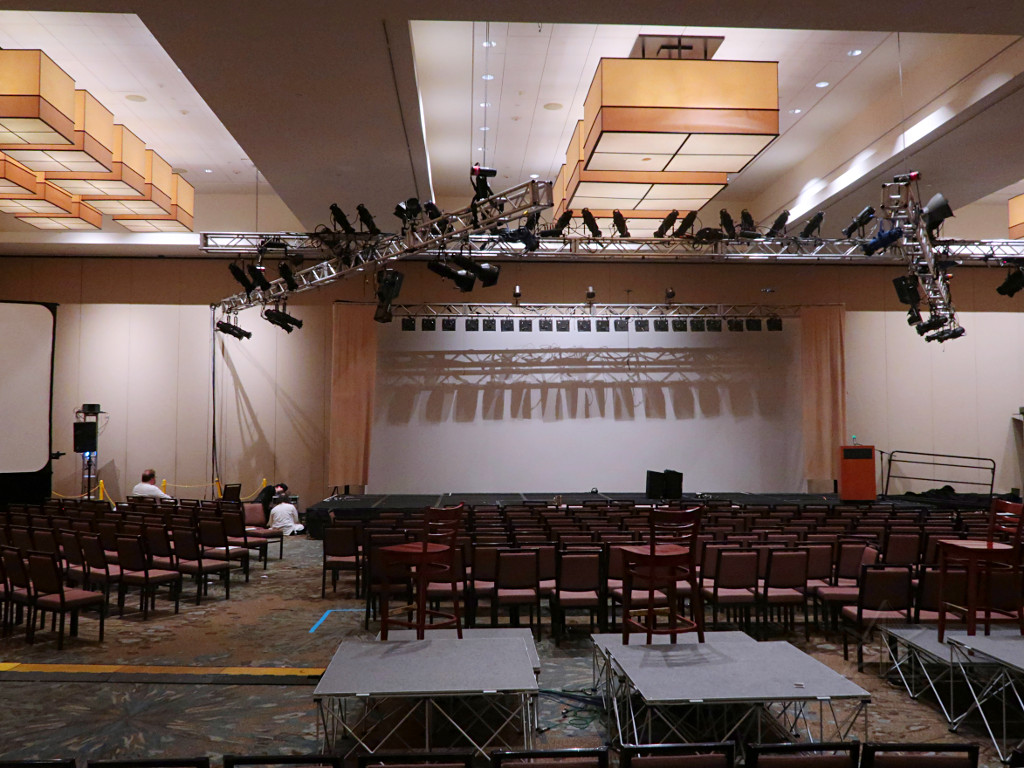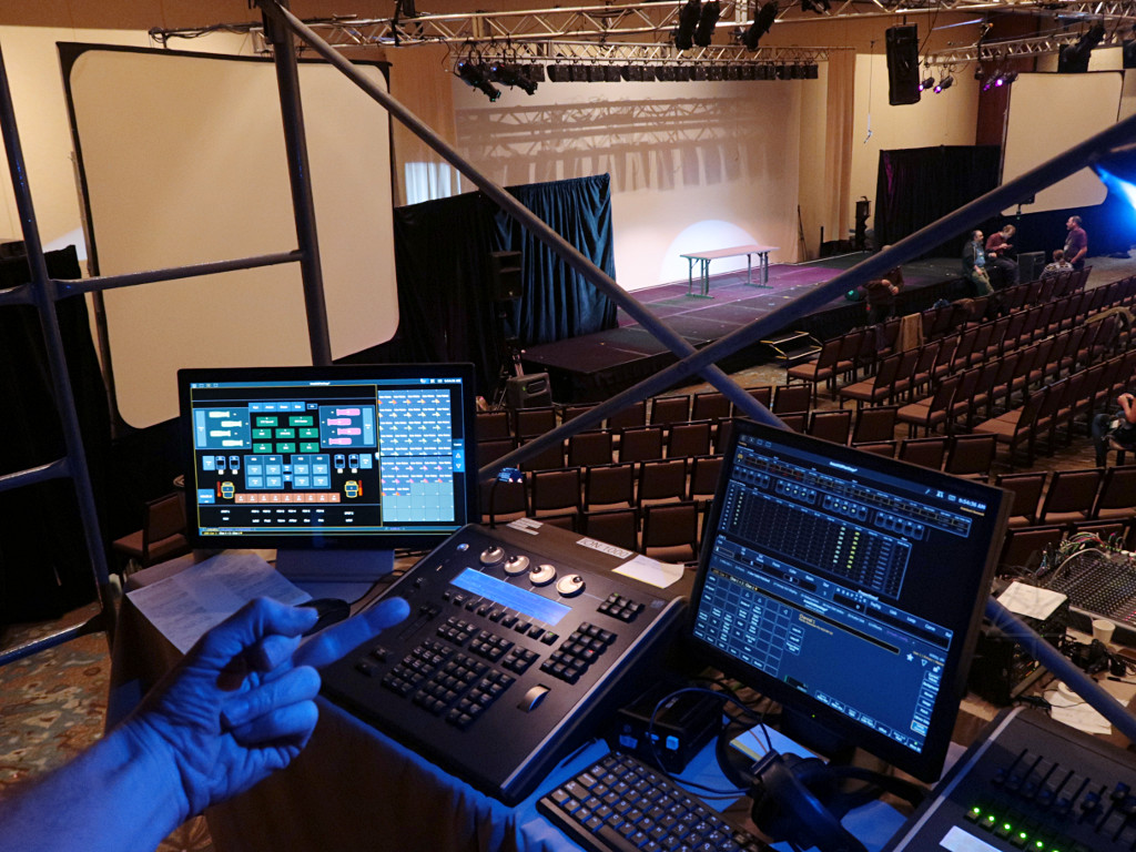 I got up early Sunday morning and brought my coffee right down to the main ballroom, because I really wanted to sit down at the Ion for a while and understand the whole deal with setting up for busking on it. The term as used here means being able to do fairly spiffy and versatile combinations of looks on the fly with a small handful of sliders, and basically play the lighting rig like an instrument along with whatever's happening on stage. Even now, a few years after its release and several software revisions based on user feedback, the Eos/Ion console family doesn't make that very easy. | |