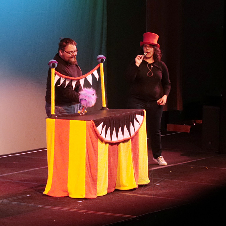I had taken a little time before con to download the latest manual and try to study up a little, and the more I wrapped my brain around the nomenclature and workflow the more I kept seeing this as a Hog wanna-be that still got a lot of stuff wrong and added needless complexity. I even asked around on our lighting list, and was pointed toward a nicely done video that Angela had put together a while back -- sort of a novel approach, but likely not compatible with what we had here. As I sat down and tried to work through recording distinctly *separate* fixture parameters into submasters and cuelists, I just got more frustrated. This would have taken ten minutes on a Hog 4. But by working carefully and un-doing some mistakes and remembering what Daniel had hinted at, I eventually got a pretty close approximation of what I wanted and thus felt reasonably ready for the "Puppetry Slam" Masquerade halftime show. |