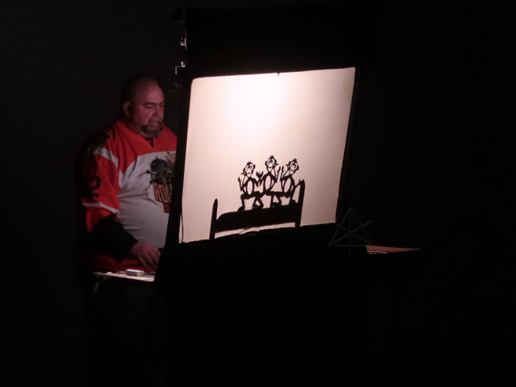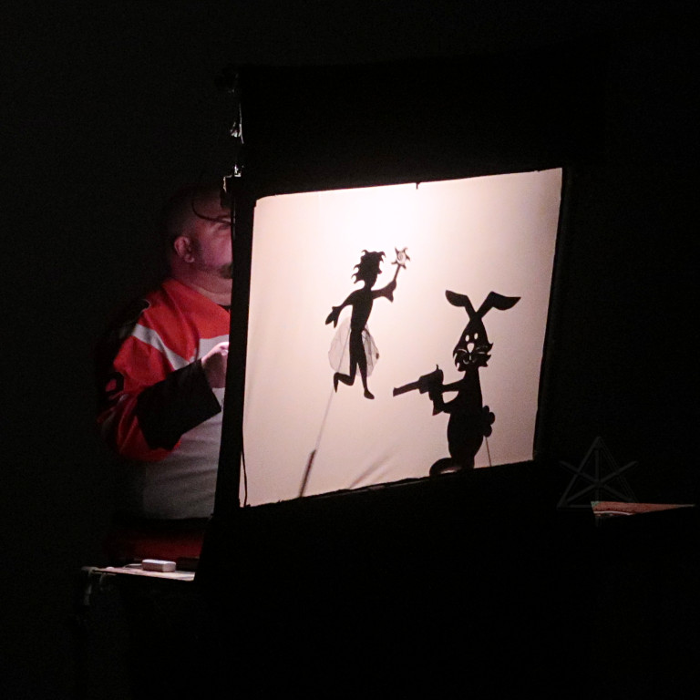 This one's cue entry said "no light", and here's why -- a shadow puppet screen, rendering such old favorites as "monkeys jumping on the bed" and "little bunny fu-fu". In this variant, Fu-Fu's arsenal escalated through billyclubs, morning-star maces, and finally a gun. Which could actually shoot visible holes through shadow field mice, in perfect time with the sound effects -- that was pretty impressive. I didn't get a chance to examine the gear to see how it was done. |