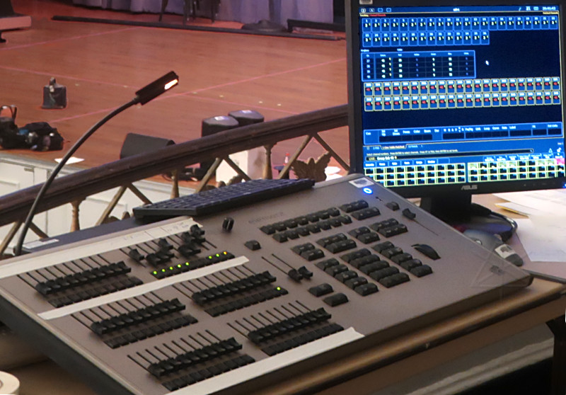 ![]() More things right and (mostly) wrong with Eos I could say that this is sort of a follow-on to a couple of other pieces on this family of controllers -- an early rant about the Ion from almost ten years ago, and some other tricks-n-tips noted during Arisia '18. Much of what's said there still applies, and taken all together with this could almost start forming an "Undocumented Eos" book. Over the years ETC has learned a few things from its market and made its share of improvements, but there are still some aspects of these controllers that can really bite the unwary. On inquiring with 4Wall as to what our controller options appropriate to Arisia's main-tent rig were, Paul decided that the Element 60 seemed the best match for a medium-scale theatrical board. It has a lot of built-in faders which easily map to individual channels, a working model that old-school operators are well used to. But every slider can also be a submaster, and with 60 of them on the faceplate a fairly large show can be set up and run without having to change submaster pages. That's fine, until you get into cue structure, fixture personalities, execution order and precedence, and basically anything that isn't a conventional dimmer. This is where Eos, the underlying operating system common to this whole family of boards from ETC, starts throwing some nasty subtleties in your path. Whether it's full-scale Eos or one of the purpose-tailored variants -- Ion, Element, Congo, Cobalt, etc -- we run into the same issues. This centers mostly on the Element, as explored at Arisia '19. Learning process In advance of the convention, as part of trying to learn more about the board I went to see if more recent versions of the offline emulator were available. I had a really old one which was missing a lot of the updated features, and hadn't fired it up in forever. In poking around ETC's website I found a Mac-specific download of Nomad, which is what they're calling the desktop/laptop based package now, which can run both as an offline editor and become an online control when supplied with an appropriate output dongle. I was astounded that the package actually *ran* on my ancient Mac, as usually newer software fails to load because the system libraries are too old. ETC must have built this cut on a sufficiently back-rev machine. Having it turned out to be really useful, since I could actually try stuff and learn what would work or not and what things actually look like in the displays. One of the biggest learning-curve speedbumps on these boards is figuring out *how* to look at what you need to see. First off, I tried to internalize ETC's wack-job nomenclature for screen and window layouts. A workspace is basically what comes up on an external monitor, and it can contain various configurations of frames which split up the screen into distinct areas. Within each frame can exist a number of displays, which are essentially windows, all of which are referenced by tabs descending from their window areas which can be clicked directly or tabbed through in sequence. Displays/tabs can freely appear and disappear depending on what you're doing and typing, and can change size and location if the command-line area called "CIA" is expanded or not. Some displays have different ways of, uh, displaying information, which the "Format" key can cycle between, and then the *amount* of displayed information can be changed with the "Flexi" key. It's a little bit like the "box model" of HTML/CSS, in a way. A given layout with displays assigned to frames within a particular workspace, all sized and formatted and "Flexi"-ed to one's liking, can be saved as a snapshot -- and liberal use of those to get back to a known state is highly recommended. A snapshot saves everything about a viewed layout, including which tabs are fronted, the size and position of objects inside a display, how many frames are assigned and where, and the state of the command-line area. [On Hog, the equivalent is called "desktop view".] Loopy LEDs Now that we have some idea of what we're looking at and more importantly how to get it back again, it's time to try controlling some lights. Generic dimmers are straightforward, and the traditional ETC syntax of <Record><bump-button> works well enought to record a scene component into a submaster. Here's an example of how the best-intended setup can start going wrong. Our rig at the time would have some LED fixtures mixed in, which are easy enough to control as separate traditional channels, but defining them with LED personalities allows use of more enhanced device-aware features like color pickers and crossfade paths. A problem arises that even if an LED device only has simple DMX slots for its colors, R, G, and B for example, the board insists on including an intensity parameter in the personality -- even if it is only a virtual concept that doesn't exist in real life on the fixture itself. Furthermore, the stock LED fixture personalities in the on-board library all default their color channels to full, so that when you bring up "intensity" on any of them you get white. The fake intensity level basically applies a reduction factor across the color channels, and for the most part works okay with manual commands and cueing. The problem with this is that typical LED control is easiest via the direct color channels only, allowing straightforward additive mixing, thus we want the color channels to start dark. Sure, we could select the units and start mousing around on a color chart, but that's harder to do when the colors get run from submasters -- because really, that makes show design visually easier. The attempted workaround this year was to copy the stock fixture in the fixture editor to a new custom type, and set the "home" value for all its color channels to 0 instead of 100. Then, I dedicated one submaster to bring all LED *intensities* only to full -- stage still dark -- and left it up. Programming more submasters only with individ