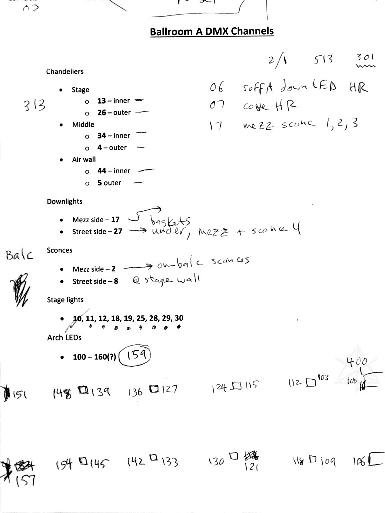 a rough map of the house dimmers and fixtures, which are now on DMX based