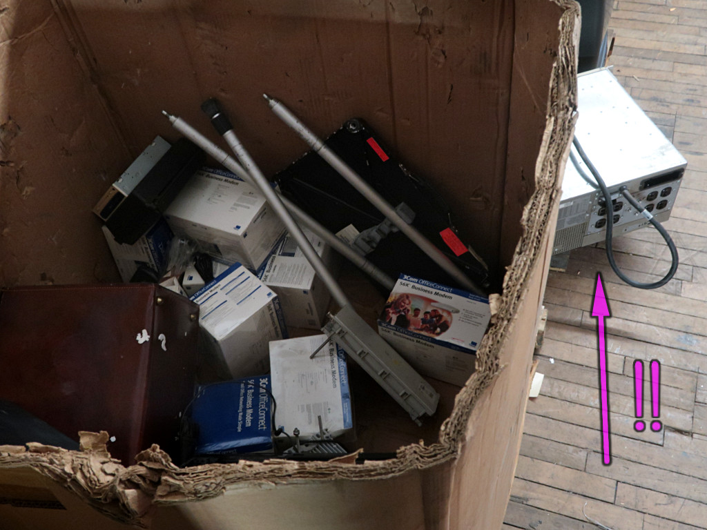 We had already struck up a fairly congenial relationship with our USAi.net neighbors, and had even purchased their old pallet jack. I had asked about this box of random tumbled-together equipment outside their door, which looked like a bunch of discards, and their lead guy Dave confirmed that it was all stuff they were getting rid of -- fair game for the taking if we wanted! The main reason I'd asked was the large APC SmartUPS that had apparently been simply tossed in [here retrieved, pink arrow] and is exactly the kind that I enjoy refurbing with minor repairs and new batteries. Today there were also some nice projector stands, and all the 56K modems anyone could possibly want these days. |