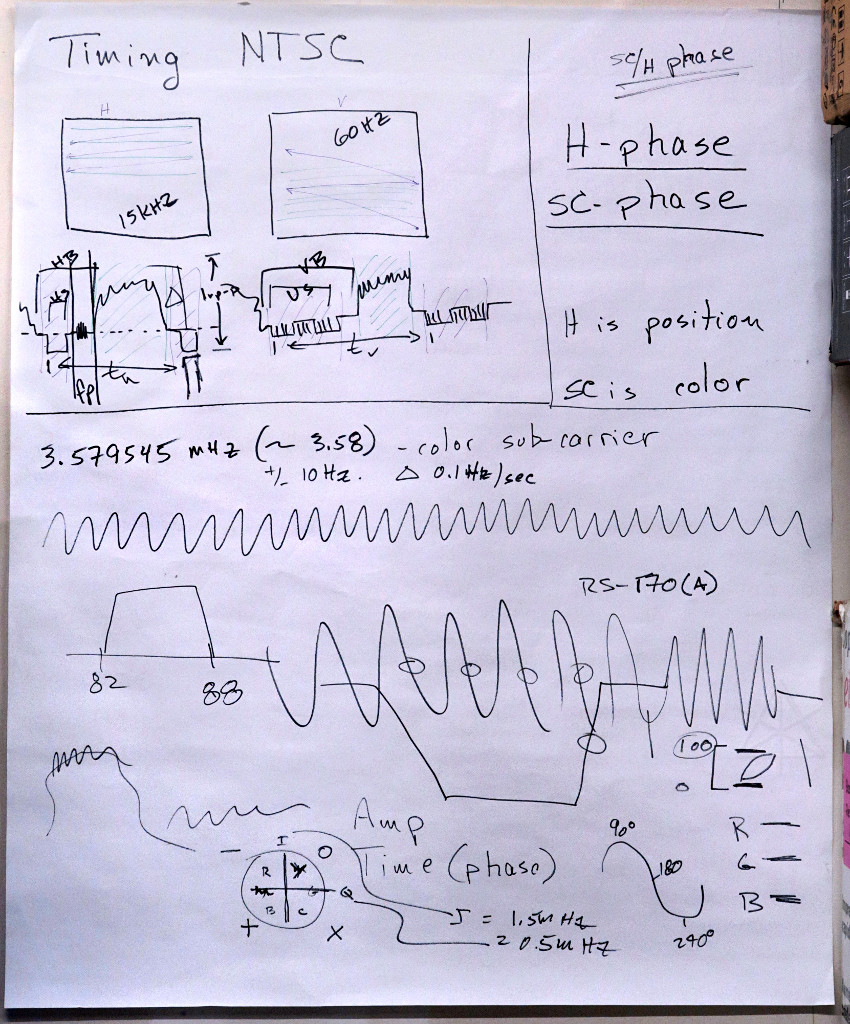 I think we left behind the big post-it on the right with Paul's fun diagram of NTSC signal timing from one of the Vidicon worksessions, but we have a backup. |