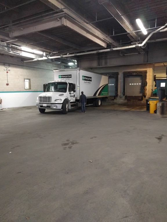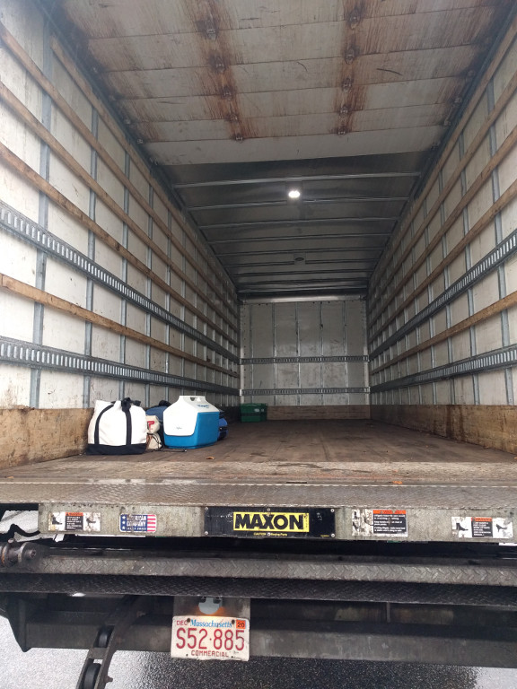 While the Grand Plan to send a truck to Storage every two hours on Monday was kind of a non-starter, they did eventually get usefully loaded and each one made a Storage run that night. Once again, reviewing the Zello log helped me recall and timeline how things played out. I had Artshow and other Galleria-side stuff in the first run, and we could still hear people coordinating all the collection and packing activities continuing back at the hotel. Lisa seemed dubious about sending the second truck, but it was *ready* and we already had an enthusiastic crew in Haverhill ready to unload, so we collectively convinced her. There was just enough time for a short dinner break for that crew before the second truck arrived; not the three-plus hour delay like last year. She needed my truck back sooner, though, so I skipped on dinner to start back, and our two trucks passed like ships in the night somewhere around the 93/495 interchange. | |
