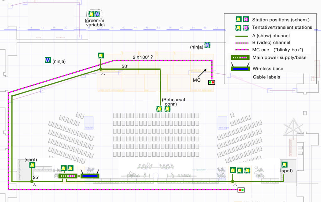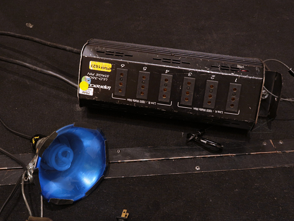 Ka-chunk! I didn't get enough illustrative pictures of this because I was busy trying to track it down. When we went to power everything up and start testing, a clearly problematic circuit from the PDU managed to take the *entire thing* out, no power anywhere. It turns out that the big 200A breaker in the power closet is a fairly sensitive ground-fault detector as well, and it had decided that there was a serious problem downstream. The visibly faulty circuit appeared to be at stage left feeding one of the ULD dimmer packs, so I got up there for some debugging... the pack's logic was still working but it smelled very bad, magic smoke had clearly escaped somewhere, and one leg of the dual-input pack did seem to have an anomalous ohmic connection between its neutral and ground. While that's not supposed to be, on a normal 120V circuit, how could that cause enough fault current to kick its own *non-GFI* breaker that fast and still trigger the master GFI in the closet?? Very mysterious, and individual circuit testing was returning bizarre results. A spare fresnel plugged into an output immediately lost its lamp, so I switched to one of my little CFL under-stage safety cliplights which seemed to work fine as a tester. But things were simply not right, and I could *feel* the buzz of a momentary high current draw in my hands when trying to plug the dimmer back into any live circuit ... Longish frantic run-around story short, it turned out that PSAV had given us a completely wrong PDU that was trying to send 208 VAC to almost every 120V device we had plugged into it. Oops. |