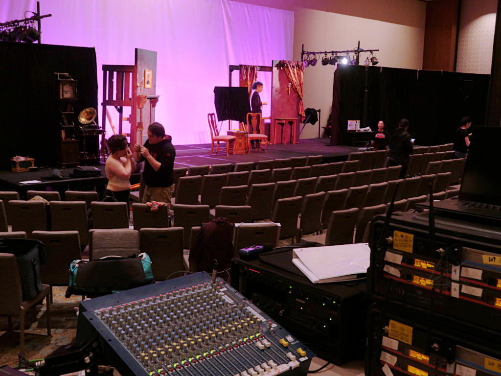 "Huh, that *should* be on..." "I hate computers." And we certainly had quite a few of them in the air, possibly not all yet configured as we needed them. Despite the hangups and delays, we eventually had a working rig in time for the Mrs. Hawking folks to load in their set and get things together for Friday night's performance. I honestly thought we weren't going to make it for a while, but we kept busting right up to the end. I believe Friday evening's "reprise" run went off well with all its needed tech in place. Kudos to Jason for tirelessly being "Mr. body-mic" for the players, too. |