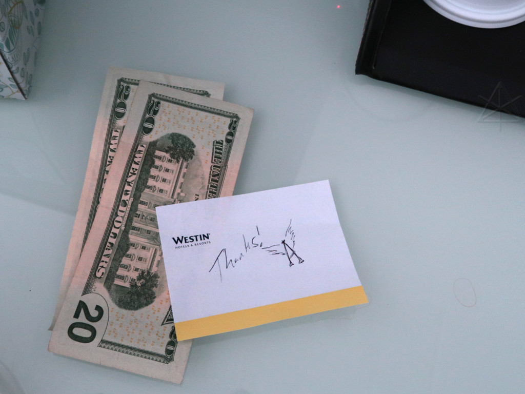 An early order of business was to clean up the room and check out, and even though we hadn't really used any housekeeping services in the interim we do try to make their lives better. Sandy drew an amusing representation of Arisia's new logo on the customary [and possibly necessary, I'm not sure] note reassuring that it was okay to pocket this. |