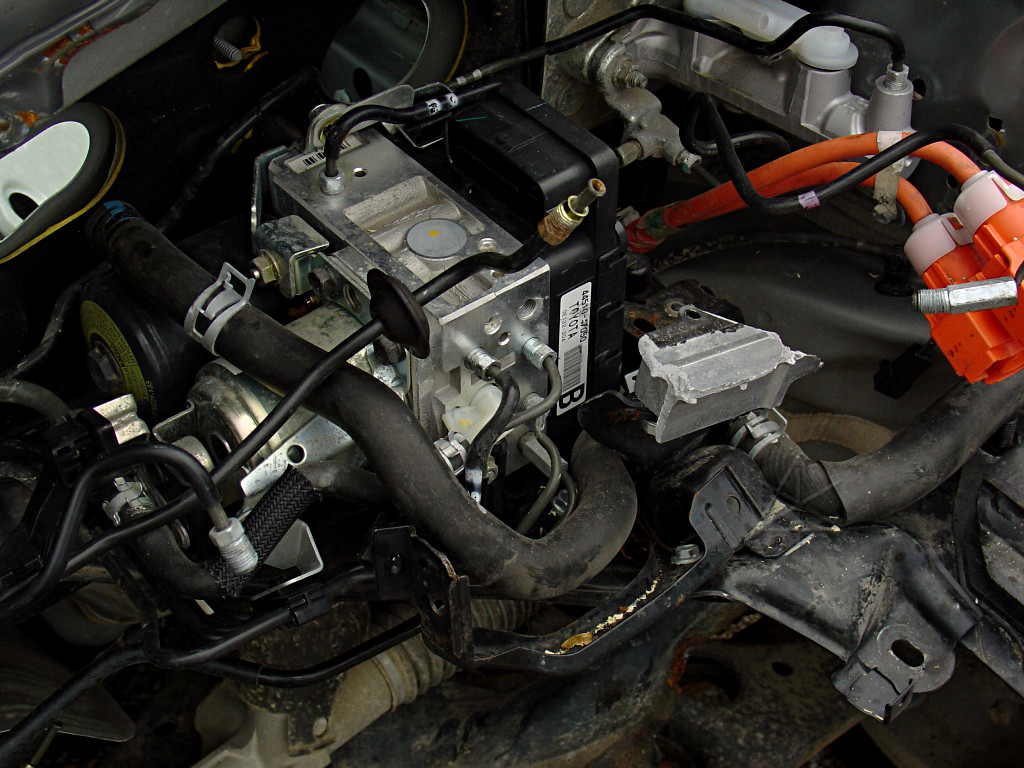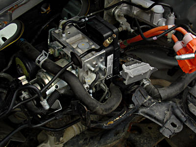 A brake actuator, for example, would be a very pricey item from a dealer. One hopes this one is still good, as opposed to the remaining fragment of an inverter case still hanging near it. Given how some of the hose fittings near it are bent, it would be prudent to examine the threads on all the flare fittings going into it, and of course do a complete flush [which is a rather involved process]. Steve set both me and his daughter to the task of pulling more parts off a couple of the already more stripped-down hulks. This is evidently part of her summer job this year; possibly not what interests her the most but one that if I'd known back then what I've learned recently, I would have killed for! I did do the obligatory summer or two in a gas station back in the day, but that was way before self-serve when one actually had to attend customers, and there wasn't much opportunity to hang out in the bays and help the mechanics with stuff. But here was a chance to totally soak myself in Prius parts for a couple of days, and I dug in with gusto. It was nice to be able to know what I was looking at and have a concept of its function and value, and banter cluefully about the condition of things with Steve. The difference is that he's got a much better idea of applying this stuff in a real-life practical fashion. But sometimes he just doesn't have time to do that and all the relatively menial labor of collecting and organizing all this stuff, so he was appreciating the disassembly help.